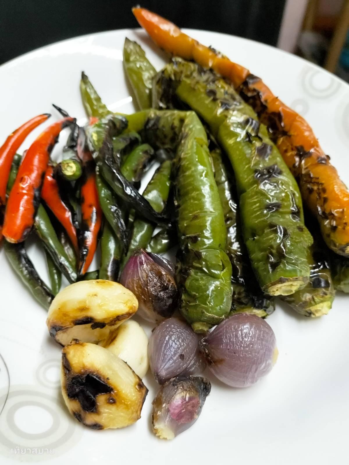 1.นำพริก หอมแดง และกระเทียม เสียบไม้ปิ้งบนเตาถ่านจะทำให้น้ำพริกมีกลิ่นหอมชวนทานยิ่งขึ้นค่ะ แต่ถ้าใครไม่สะดวกใช้คั่วบนเตาแก๊สแทนก็ได้ค่ะ