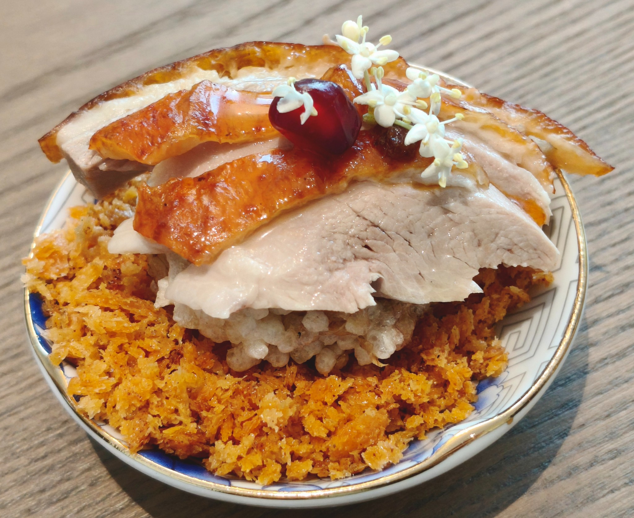 เป็ดย่างซอสหมาล่าเสิร์ฟบนข้าวหอมมะลิทุ่งสัมฤทธิ์