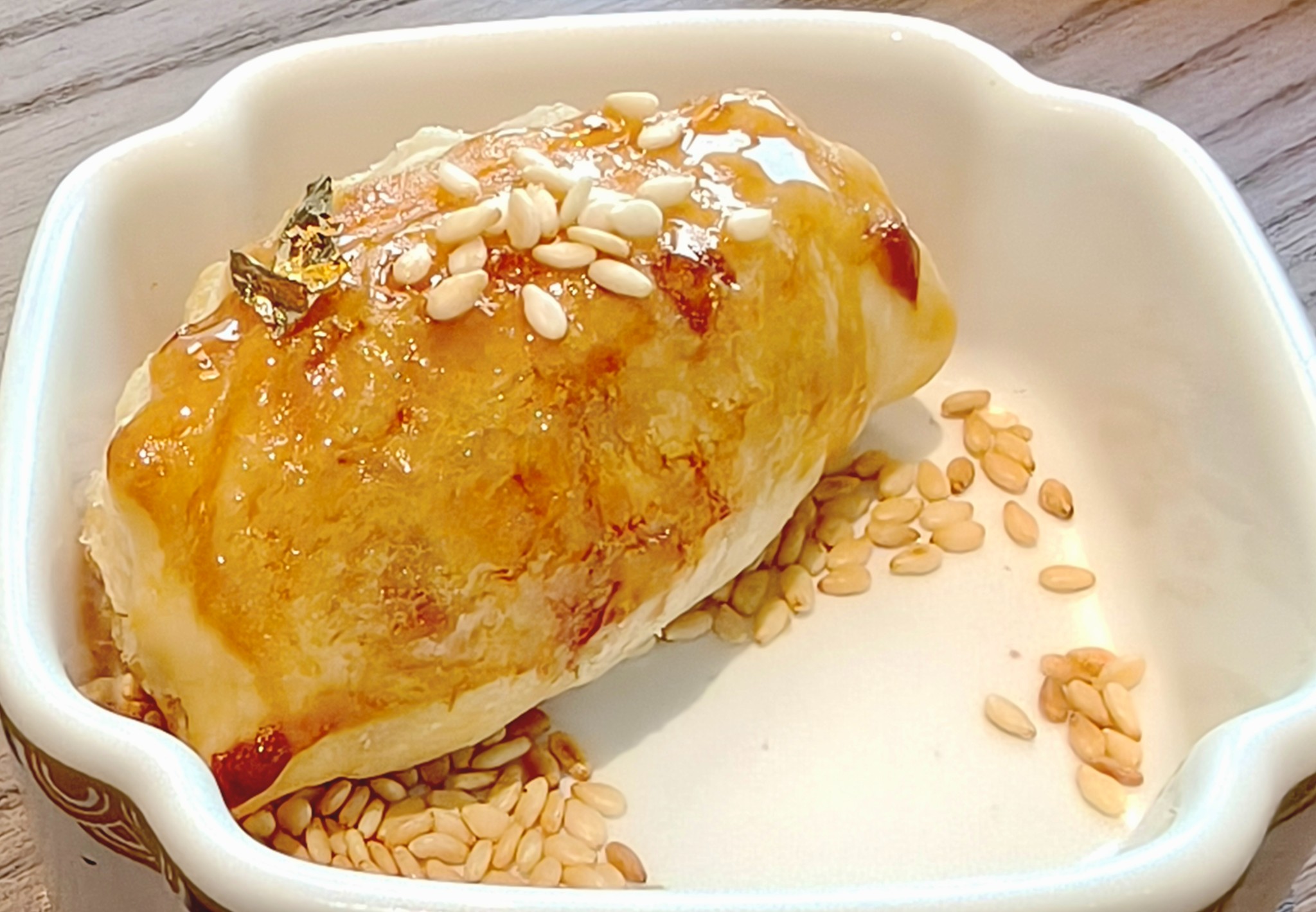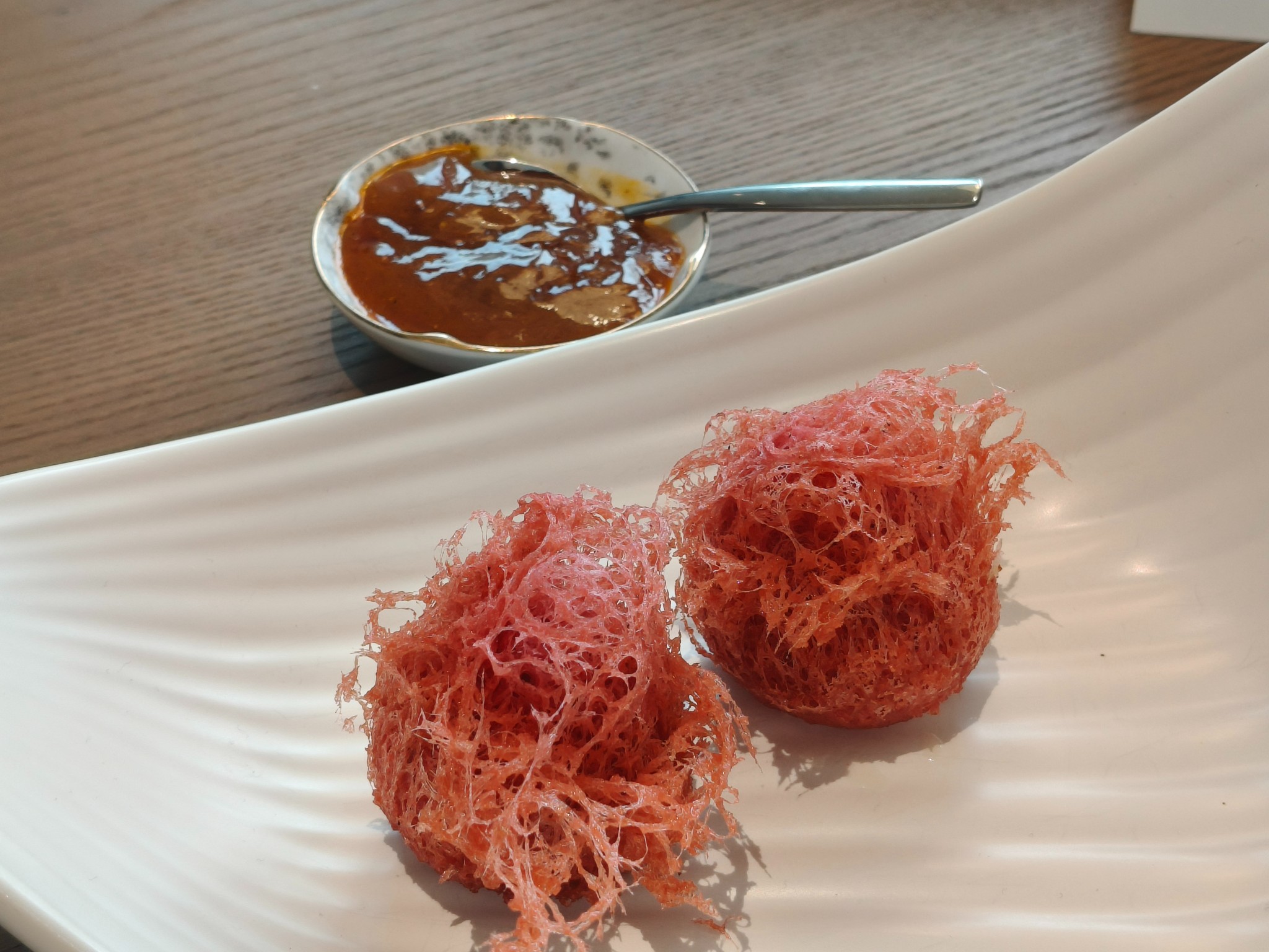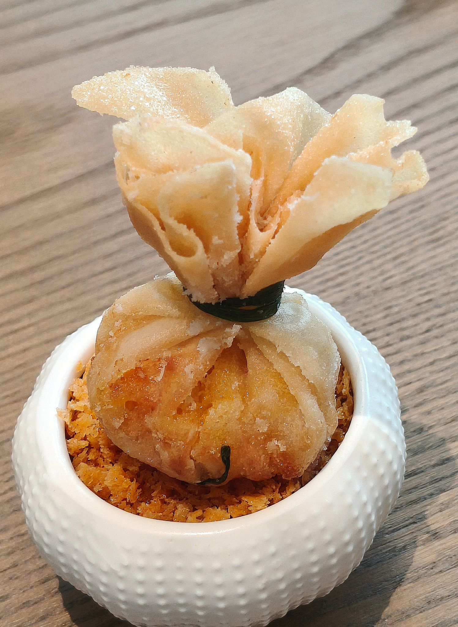 ปอเปี๊ยะไส้กุ้งก้ามกรามกาฬสินธุ์และมะยงชิด (อันนี้ดูจากหน้าตาตอนแรกคิดว่าเป็นขนมถุงทอง)