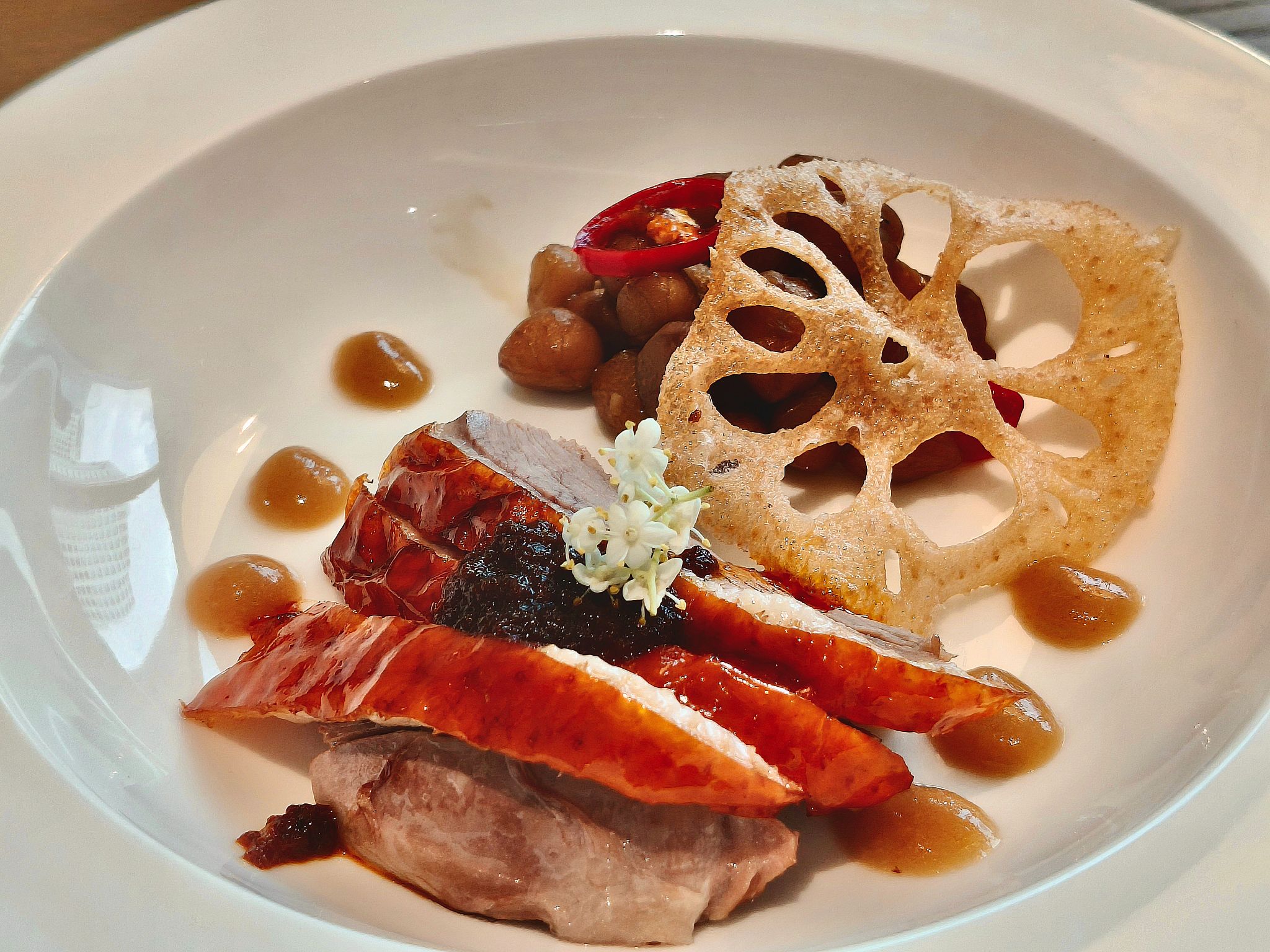 เป็ดย่างเครื่องเทศพริกหมาล่า มีรากบัวทอด ดูน่ากินมาก ๆ
