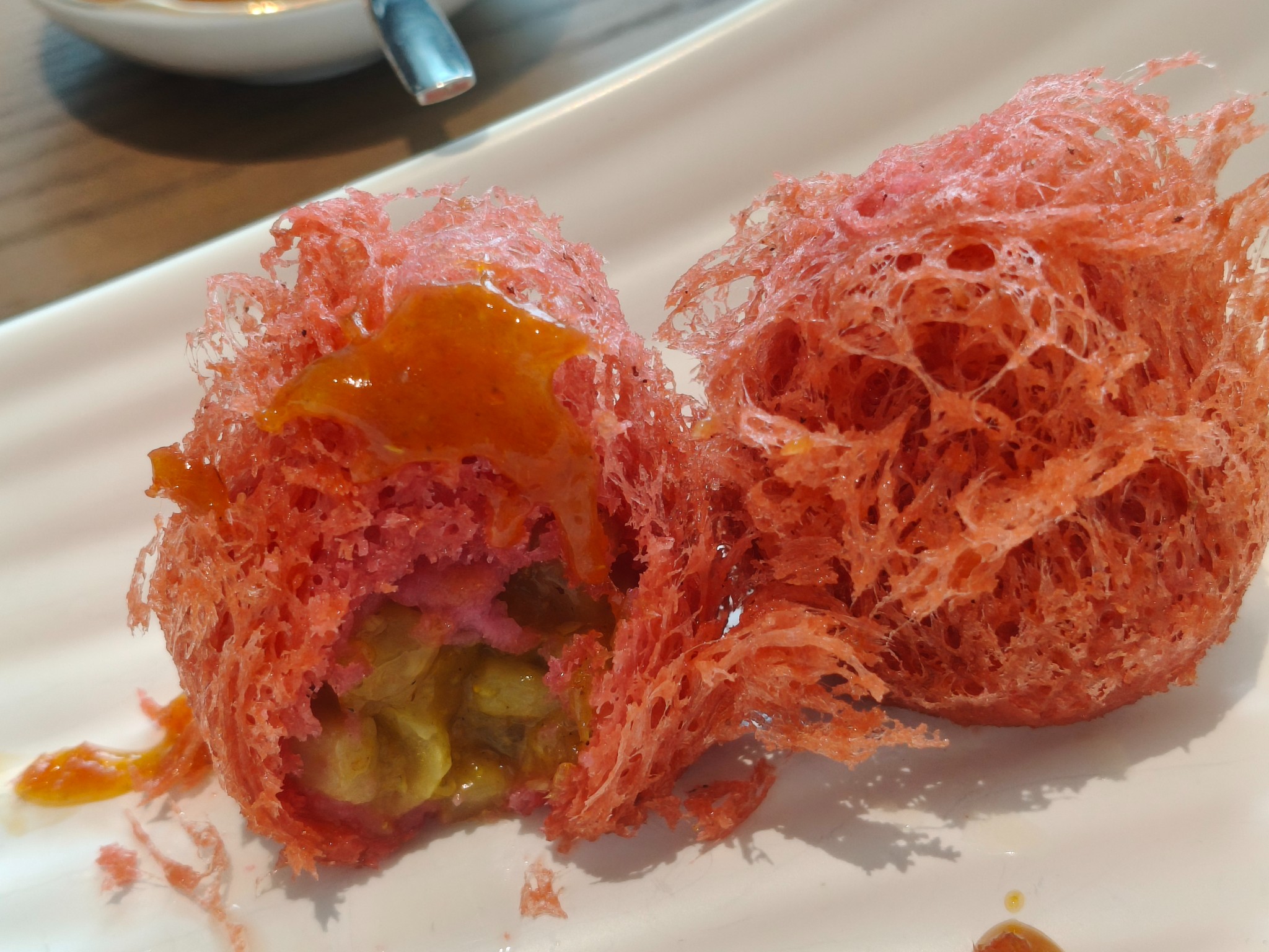 มังสวิรัตน์ได้เป็นเผือกทอด ที่ด้านในเป็นข้าวโพดหวานผัดเครื่องเทศ ราดน้ำจิ้มสามรถข้น ๆ อร่อยมาก ๆ