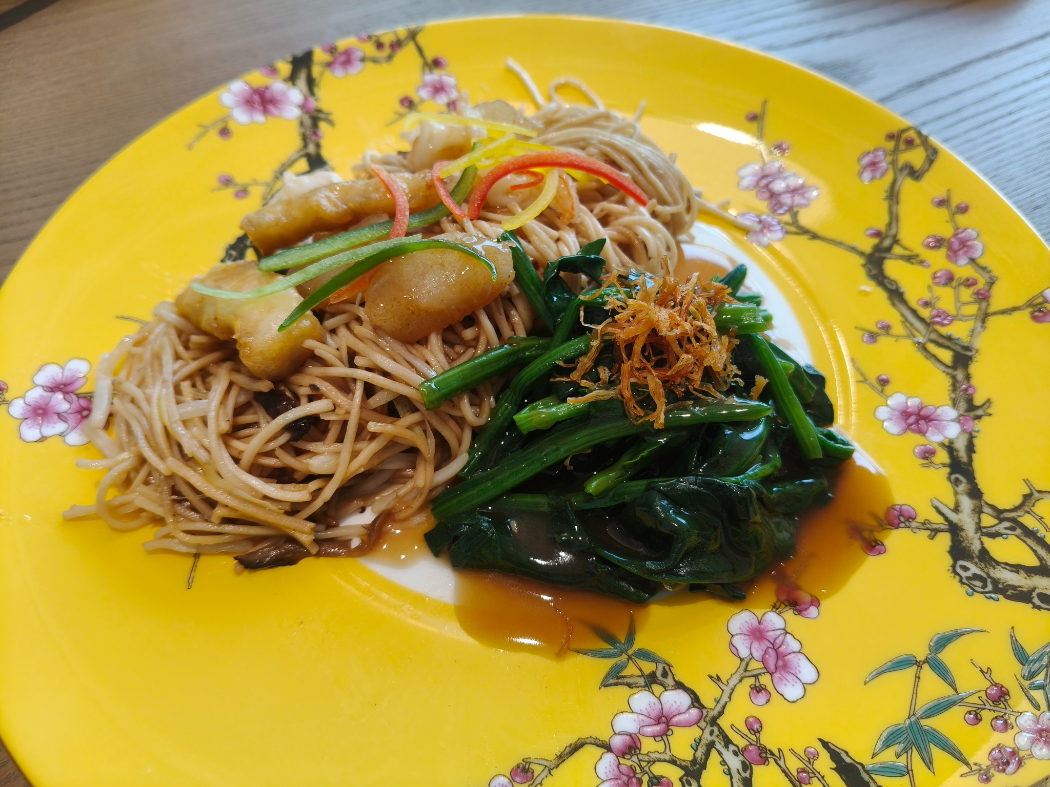 อาหารคาวจานสุดท้ายด้วยหมี่ซั่วผัดทะเลรวม และปวยเล้งซอสเป๋าฮิ้อ