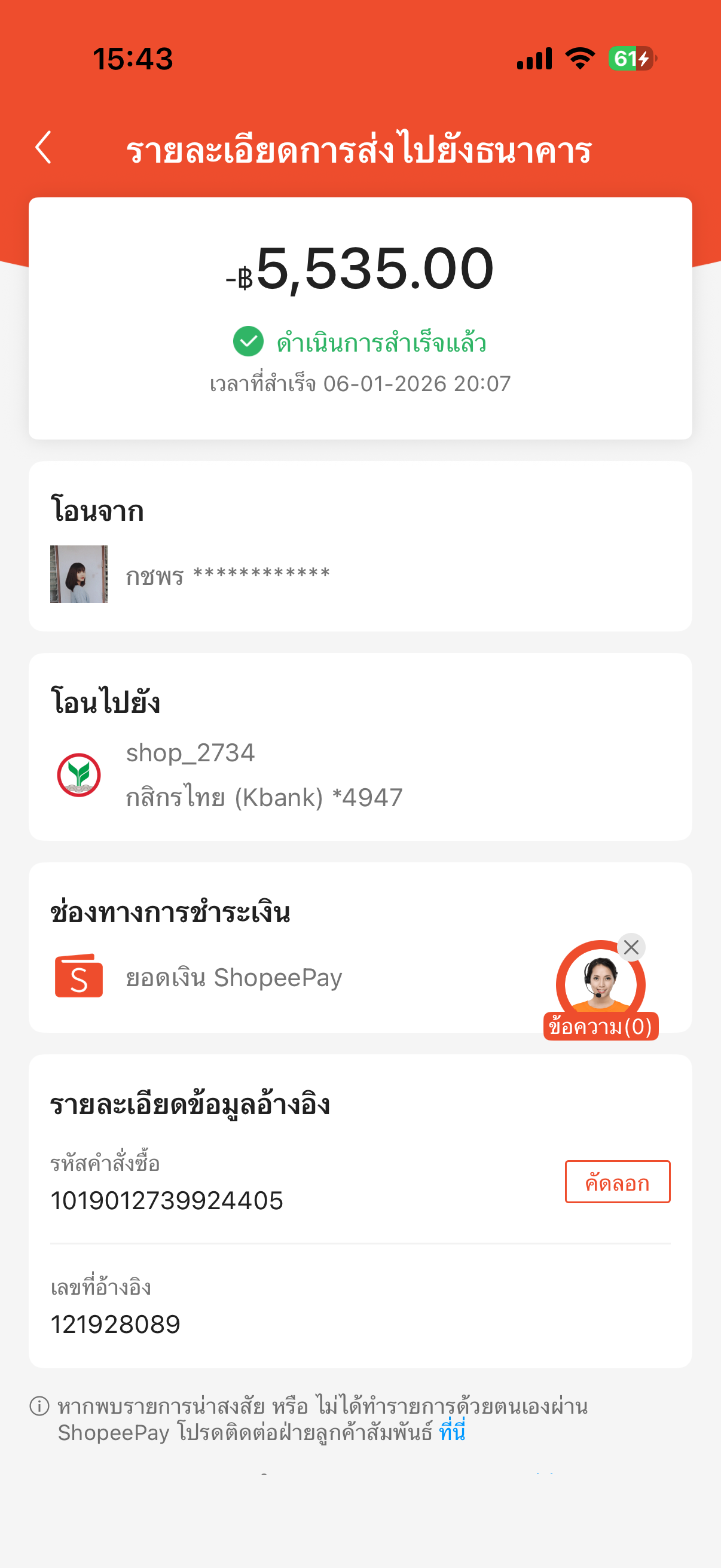 เราทำการโอนเงินจาก ShopeePay เข้าบัญชีธนาคาร แต่ปกติเราจะโอนเข้าธนาคาร SCB แต่วันนั้นเราโอนเข้ากสิกรไทย เราเคยผูกบัญชีกสิกรไว้กับ ShopeePay ค่ะ เราก็เลยไม่ได้ดูเลขบัญชี ก็เลยกดโอนเงินใส่รหัสไป แต่ บัญชีที่ผูกกับ ShopeePay ของเราไม่ใช่ธนาคารเรา ซึ่งแปลกใจมากว่าบัญชีนี้มาผูกกับธนาคารเราได้ไง แต่เราก็ได้ทำการแต่ทำการโอนเงินเข้าไปแล้ว ก็เลยติดต่อหลังไมค์หาเจ้าหน้าที่ได้ชื่อมาค่ะ เราเอาชื่อไปค้นหาใน Facebook ซึ่งก็เจอเจ้าของบัญชี เราก็ได้คุยกับเจ้าของบัญชีเจ้าของบัญชีเค้าก็ดีค่ะ เค้าติดต่อกับธนาคารเพื่อแจ้งกับธนาคารว่ามีการโอนเงินเข้ามาผิดและสามารถดึงเงินกลับได้เลย เราได้ทำการเราได้ทำการติดต่อเจ้าของบัญชีวันที่ 13 มกรา และได้แจ้งความภายในวันนั้น และติดต่อทาง Shopee เพื่อให้เขาดึงเงินกลับ ต่อมาวันที่ 15 มีการดึงเงินกลับเรียบร้อยแล้ว ปัจจุบันวันที่ 5 กุมภา เงินยังไม่เข้าบัญชี ShopeePay เราเลยค่ะ แต่ว่ามีเงินดึงคืนจากบัญชีตั้งแต่วันที่ 15 มกราแล้ว คุยกับเจ้าหน้าที่ก็คุยไม่รู้เรื่องค่ะ ประเด็นคือเราอยากรู้ว่าในเมื่อมีการดึงเงินคืนแล้วทำไมประเด็นคือเราอยากรู้ว่าในเมื่อมีการดึงเงินคืนแล้วทำไมเงินไม่เข้าบัญชีเราสักทีคะ