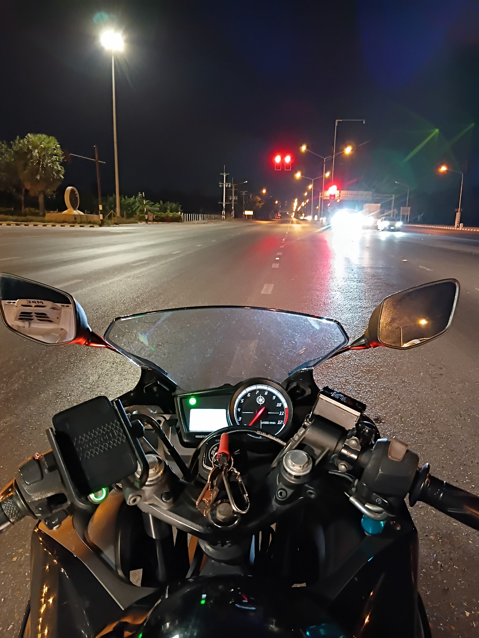 ก่อนจะแวะเติมเต็มถังสักที แล้วก็บิดกันอีกยาาาวววววววว จากสมุทรสาครเข้าสู่สมุทรสงคราม ผ่านคลองโคนเลี้ยวซ้ายเข้าเพชรเกษมเข้าสู่เพชรบุรีอย่างเต็มตัว บิดมาเรื่อย ๆ ไม่รีบเร่งอะไรมาก แต่ให้ตายเถอะ หนาวอ่ะ ในกรุงเทพฯ ช่วงนี้อากาศไม่เย็นแล้วนะ แต่ว่าออกจากกรุงเทพฯ มาไม่ไกล อากาศเย็นลงอย่างชัดเจนเลย ก็เลยต้องแวะข้างทางเอาแขนเสื้อลงแล้วผูกผ้าพันคอในลักษณะผ้าบัฟกันไม่ให้ลมเข้าคอช่วยให้อุ่นขึ้น ก่อนจะบิดคันเร่งไปกันต่อ ท้องฟ้าเริ่มสว่างเมื่อเข้าเขตเขาย้อย รถบนถนนมีประปราย ไม่ได้แน่นหนามาก ก็ตามประสาวันออกทริปนั่นแหละครับที่ผมมักจะหาเรื่องออกทริปในวันธรรมดา