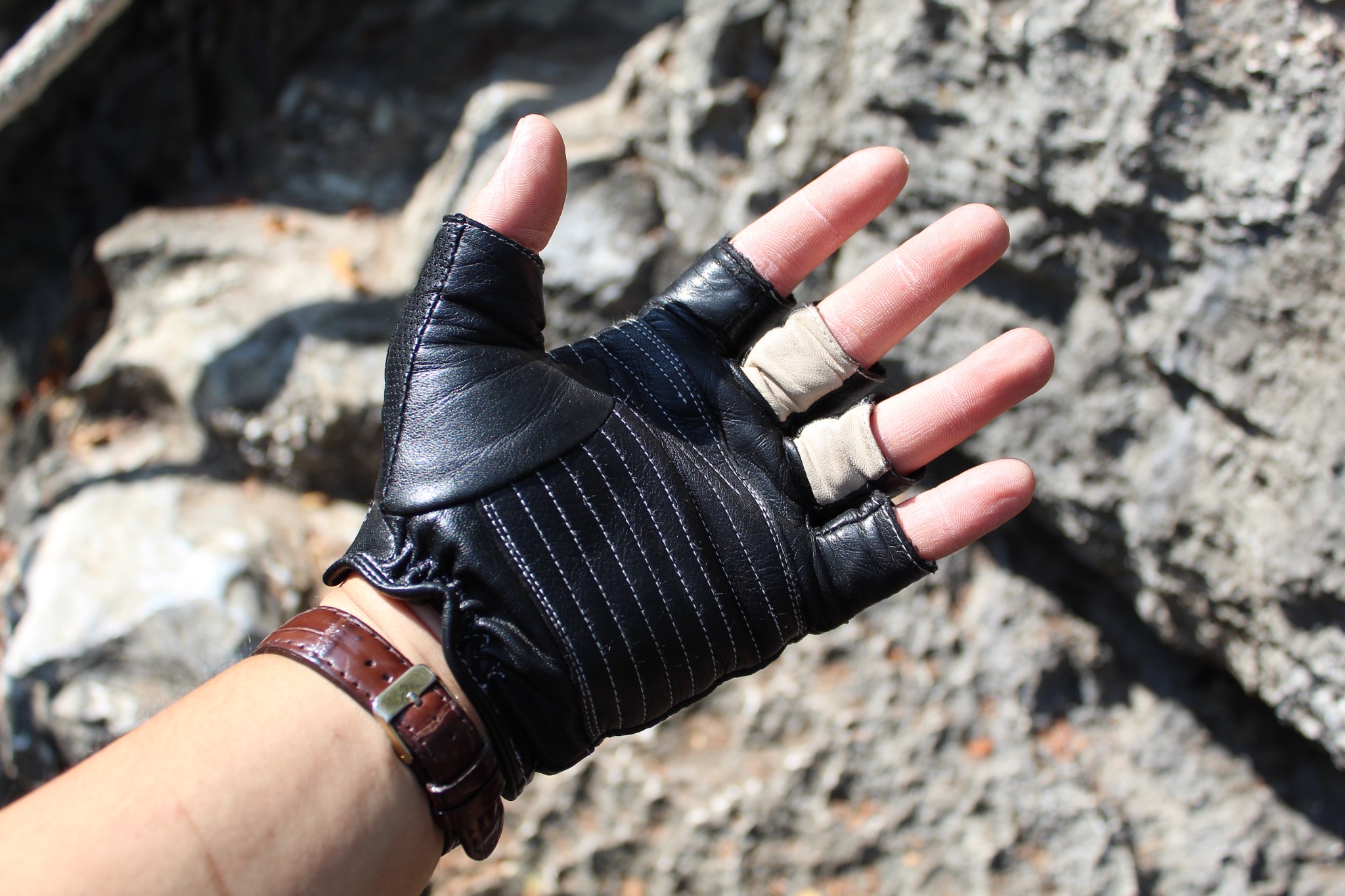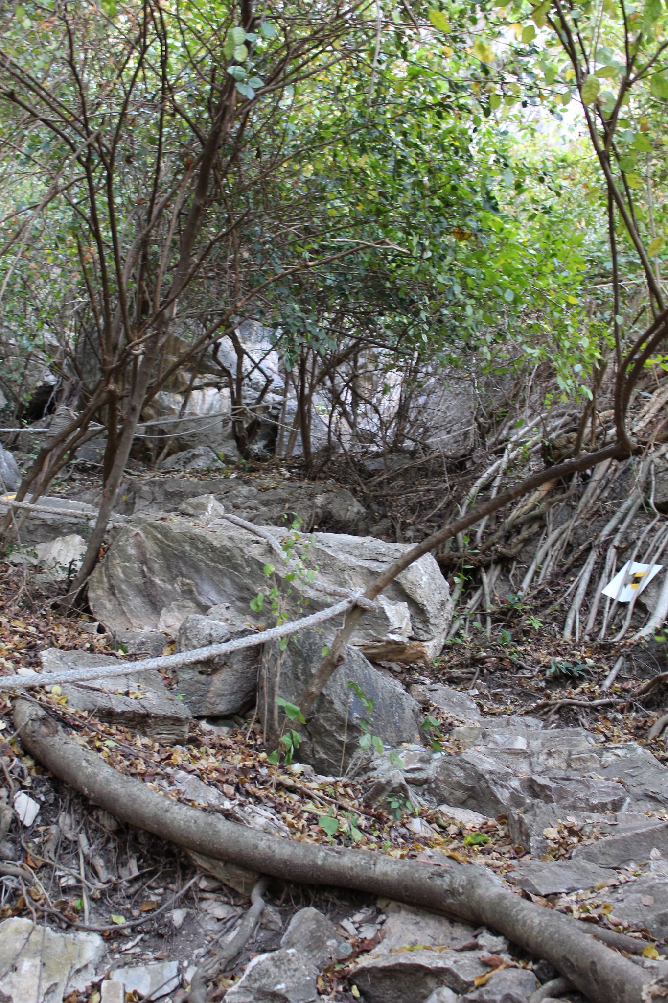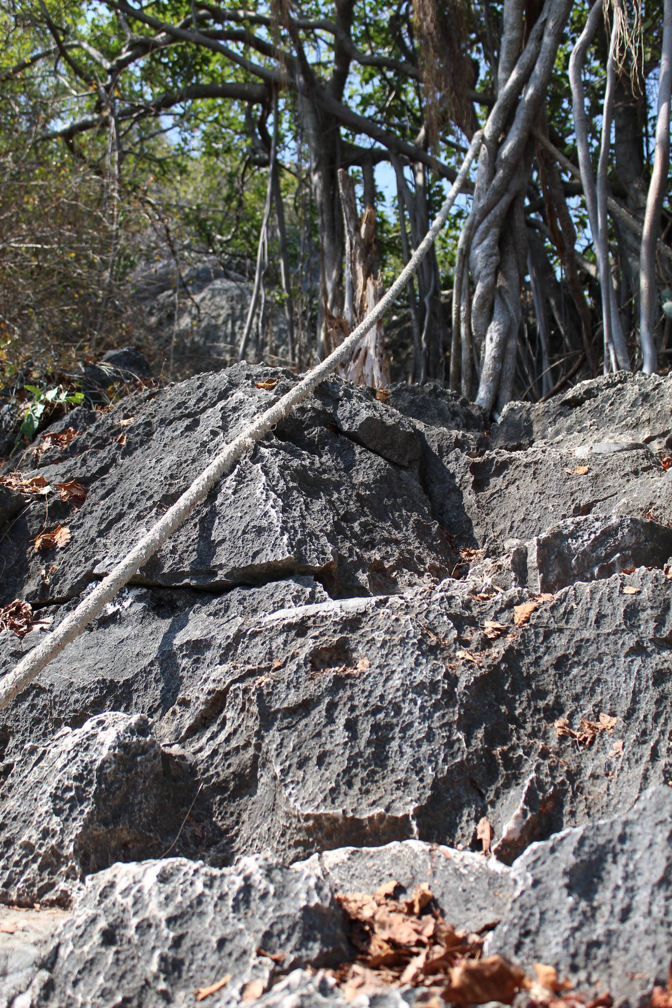 ผมต้องจับเชือก แล้วค่อย ๆ ใช้ขาไต่ลง โชคดีที่ผมไม่ได้ถอดถุงมือขับมอไซค์ ก็เลยจับเชือก จับกิ้งไม้ หรือจับก้อนหิน เพื่อช่วยพยุงตัวได้