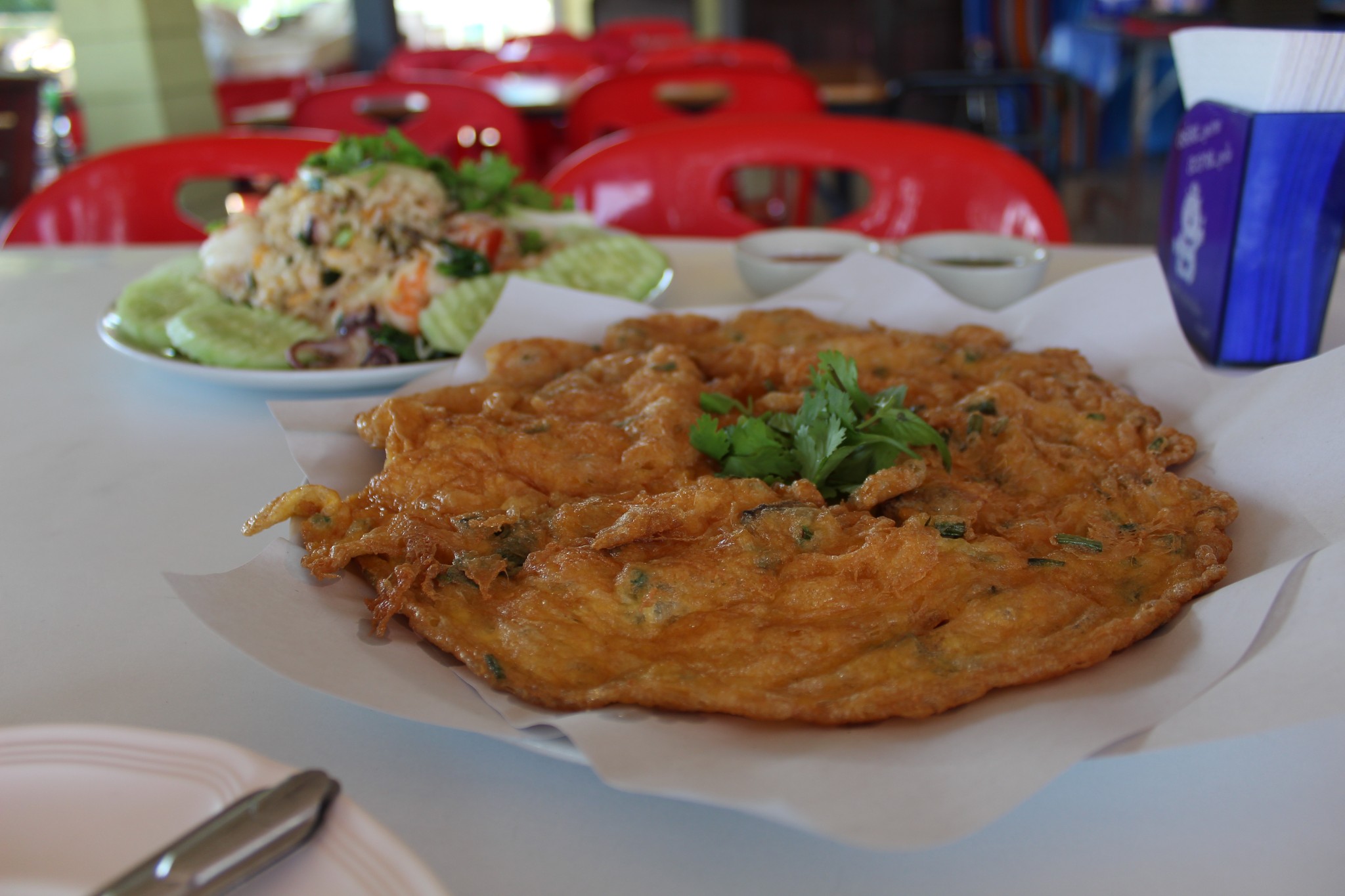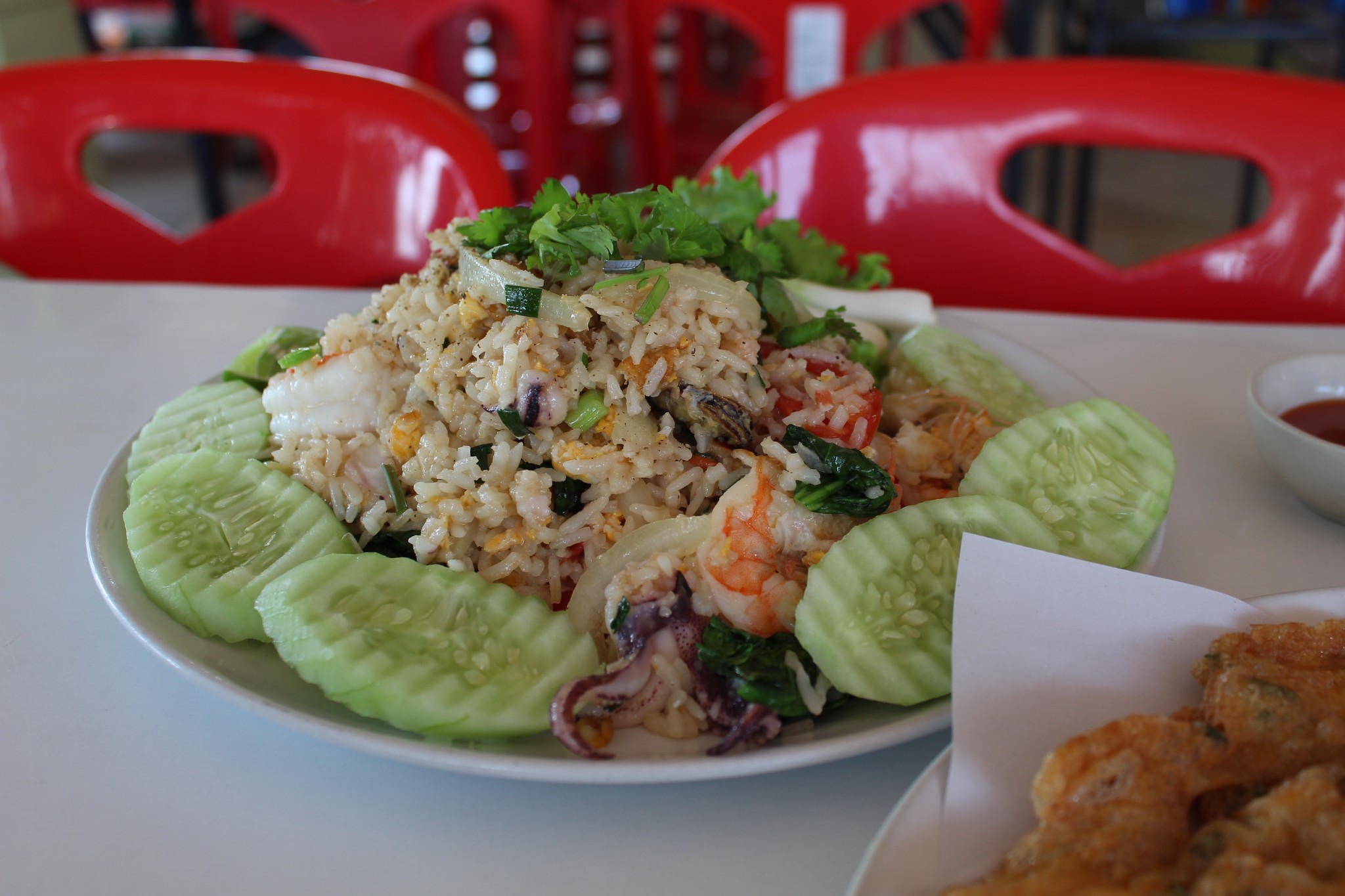 พร้อมไข่เจียวหอนางรมอีกหนึ่งหน่วย ร้านนี้เป็นร้านอาหารสไตล์บ้าน ๆ แบบว่า บ้าน ๆ จริง ๆ นะครับ อย่างข้าวผัดก็เป็นข้าวผัดแบบพื้นบ้าน ใส่มะเขือเทศใส่คะน้าด้วย แถมข่าวก็คลุกไข่ไม่ทั่วด้วยซ้ำ ไม่เหมือนกับข้าวผัดแบบข้าวผัดจีนตามภัตตาคารที่จะคลุกข้าวกับไข้ให้เข้ากันแบบสุด ๆ แต่ถึงแบบนั้นก็เถอะ มันอร่อยมากครับ ทั้งกุ้งทั้งปลาหมึกสดมาก แต่ยังตัวใหญ่ด้วย