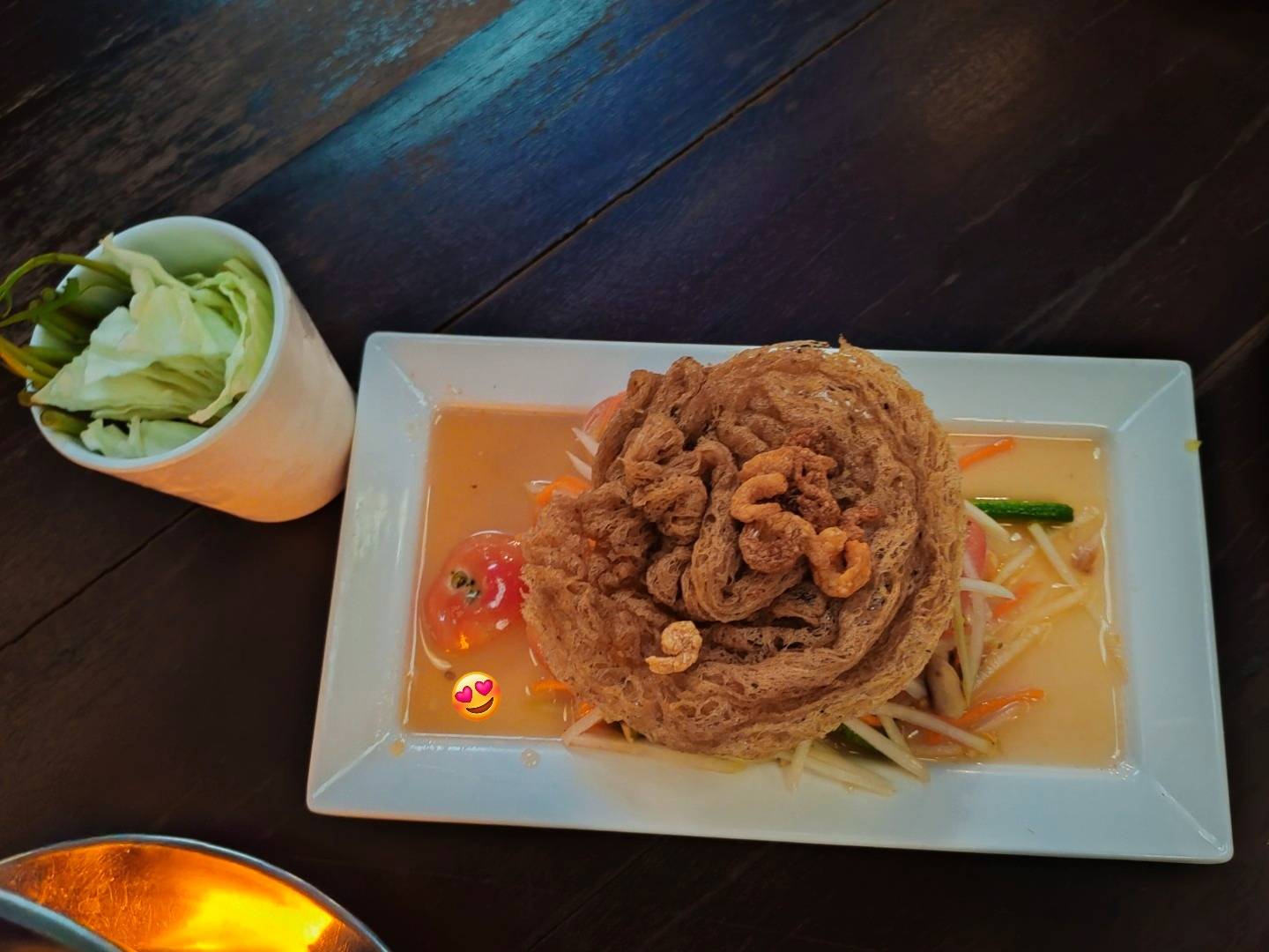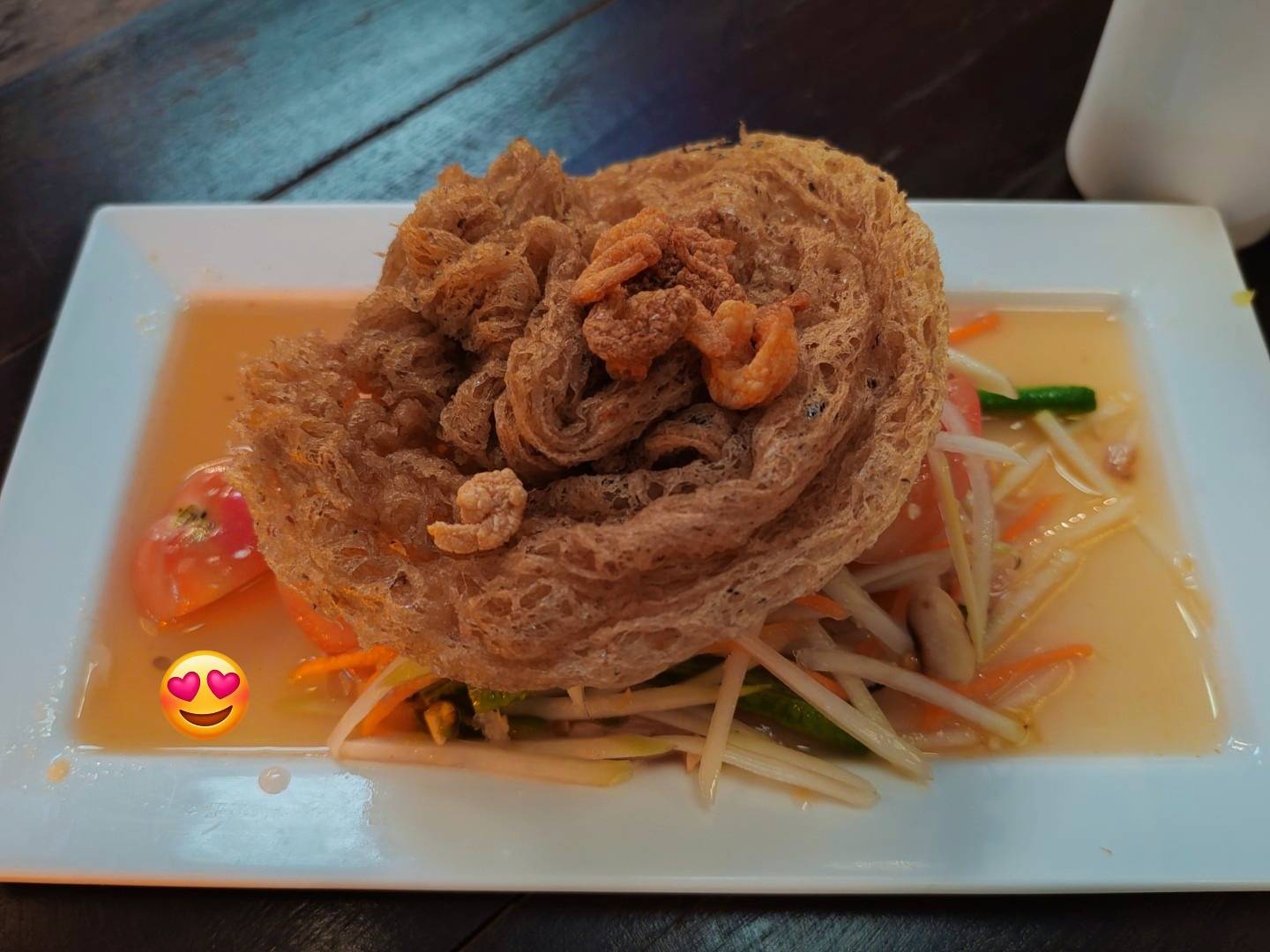 ร้านอาหารไทย อีสาน ซีฟู้ด​ปนใต้หน่อยๆ วัตถุดิบคือดีมาก  จานแรก สั่งตำไทยปลาดุกฟูครับ