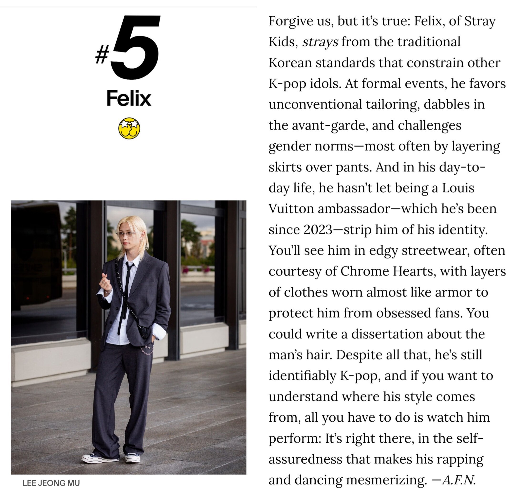 การที่เฟลิกซ์ได้อันดับที่ 5 นับว่าน่าประทับใจมาก เขาเป็นคนมีสไตล์และมีเสน่ห์ แตกต่างจากไอดอลเคป็อปในปัจจุบันอย่างสิ้นเชิง