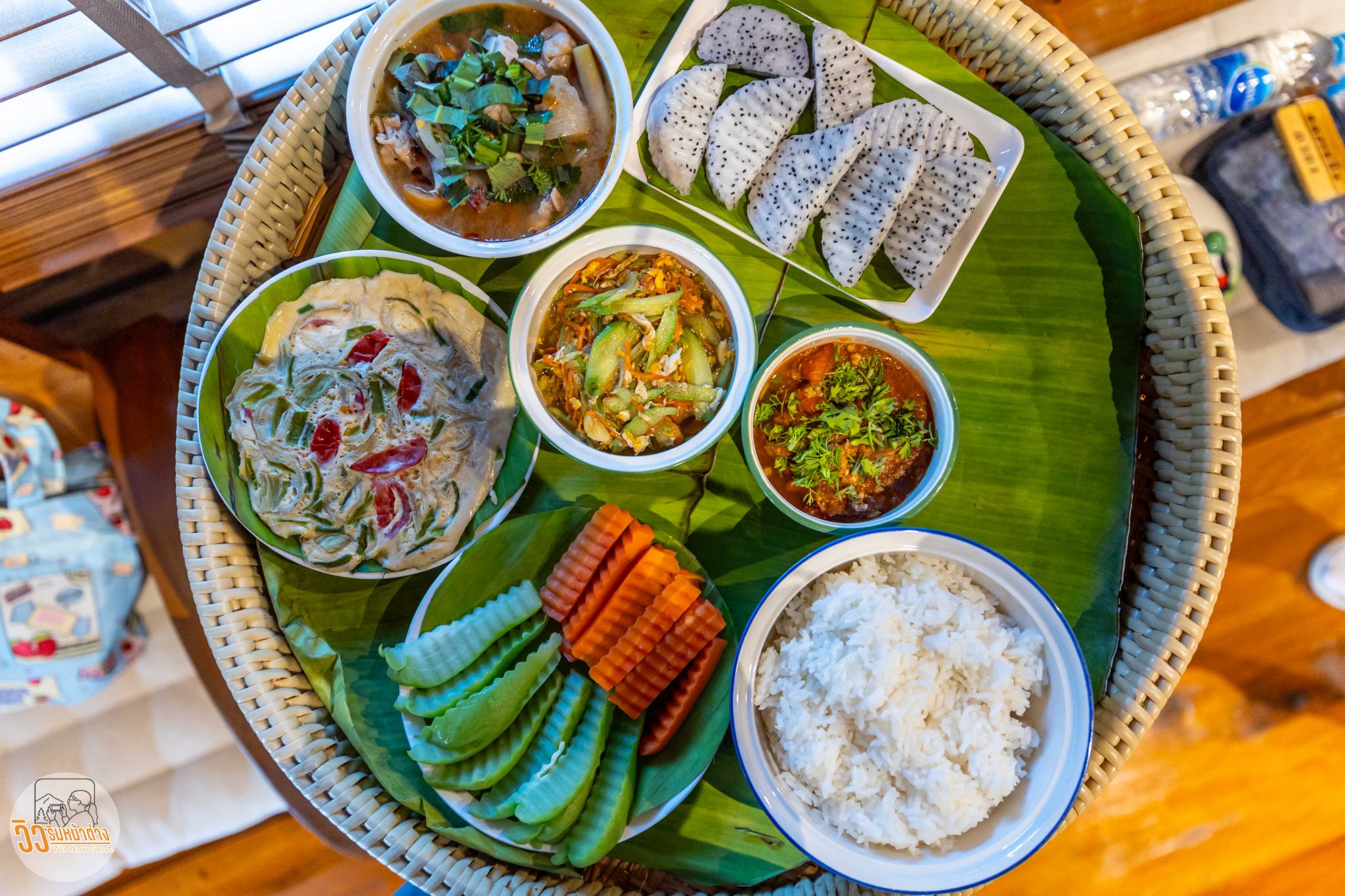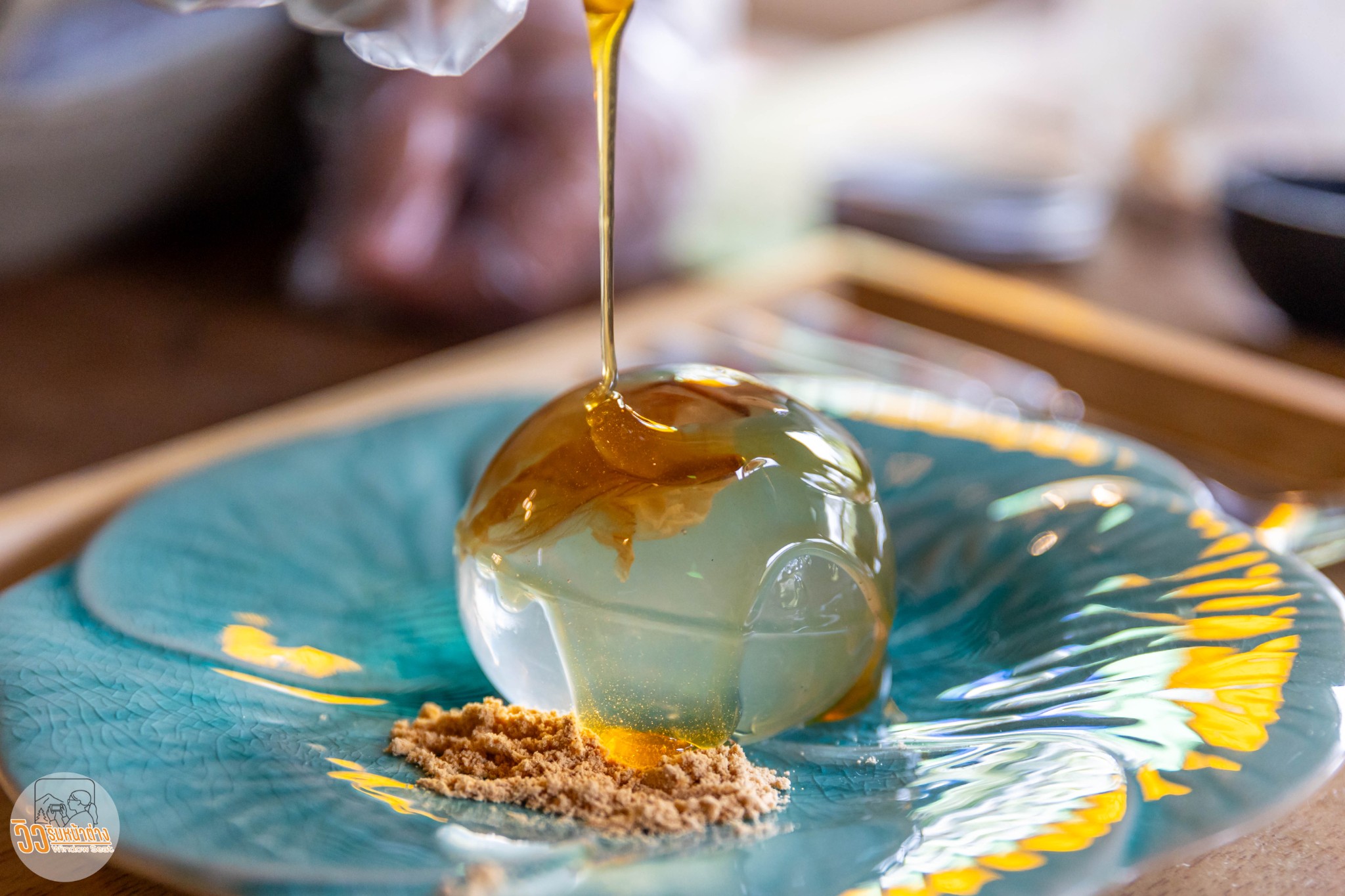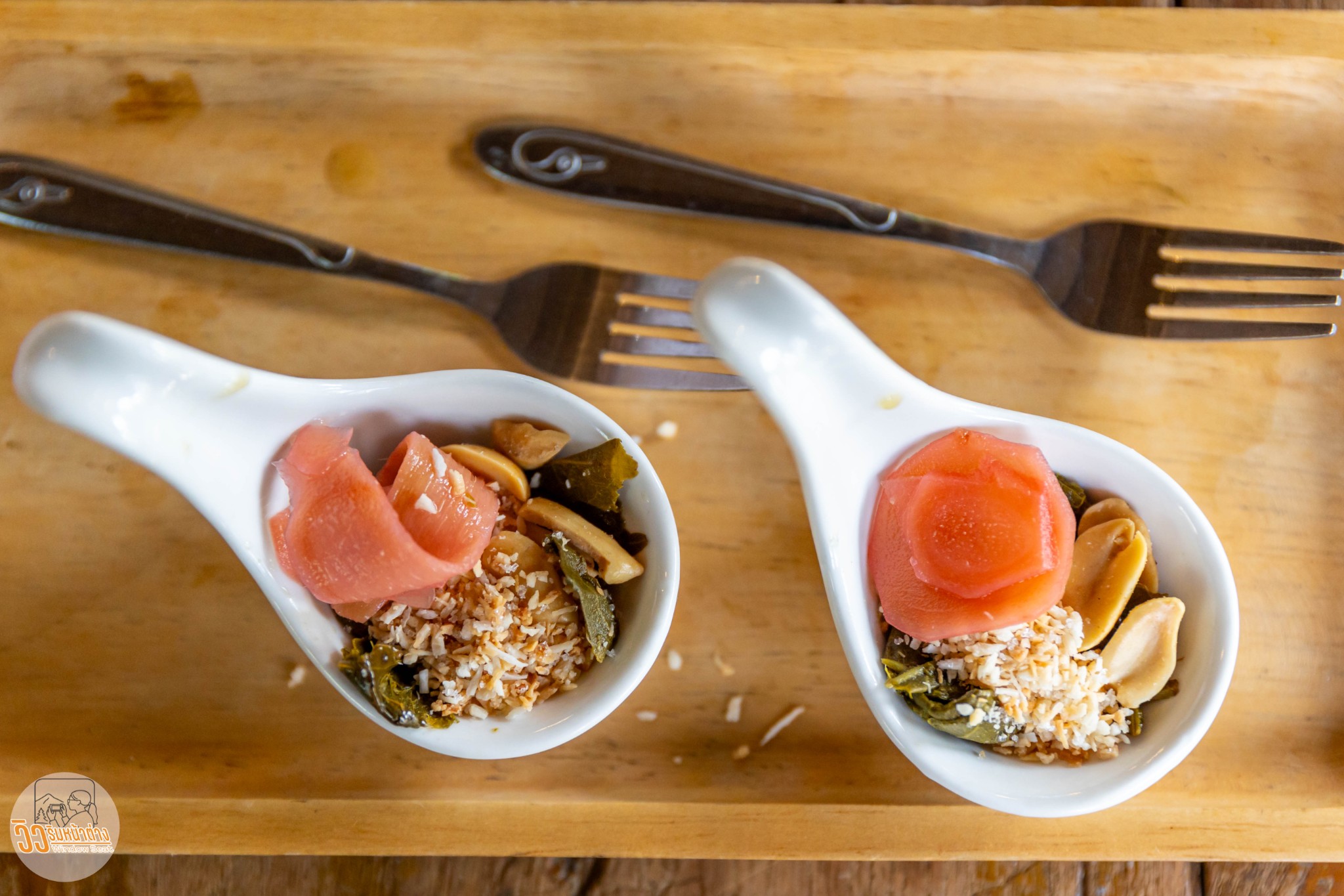 คุณพี่เจ้าของร้านเอาอาหารพิเศษนอกเมนูมาให้ชิมสองอย่าง อันแรกเป็น “ขนมหยดน้ำดอกเสี้ยวน้ำผึ้งป่าเหมี้ยง” เป็นขนมหยดน้ำข้างในเป็นดอกเสี้ยวราดด้วยน้ำผึ้งป่าเหมี้ยง รสชาติหวานแต่ไม่บาดคอ หอมกลิ่นน้ำผึ้ง ส่วนดอกเสี้ยวมีกลิ่นเฉพาะตัวนิดหน่อย ทานไม่ยาก