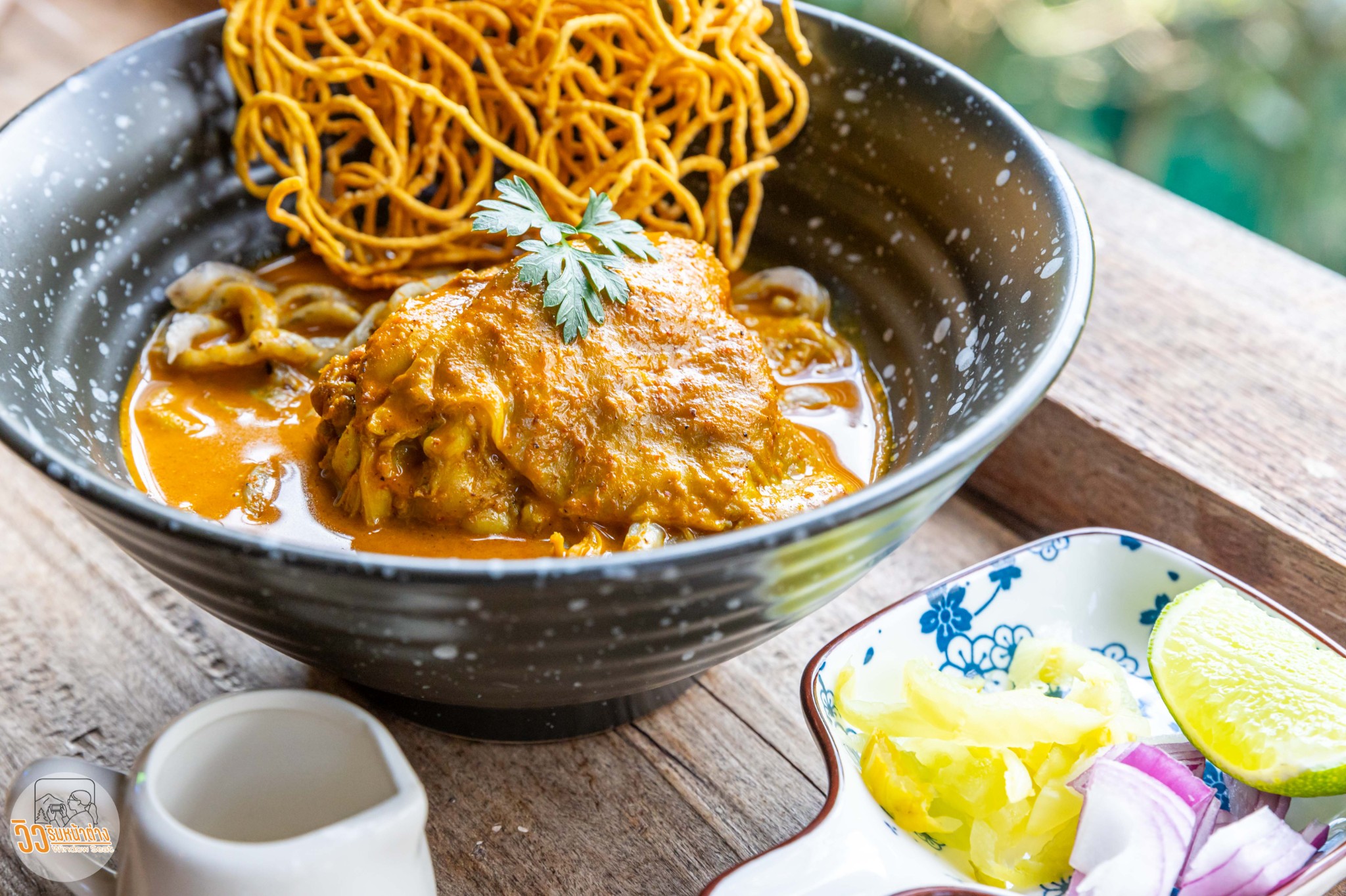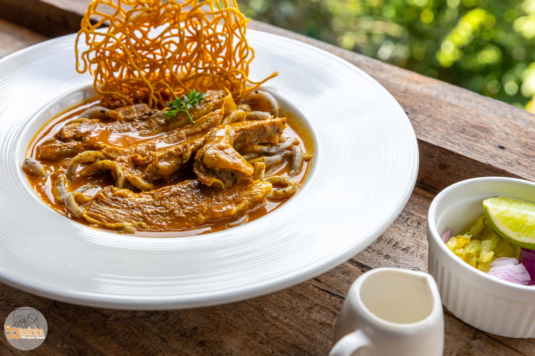 อาหารของที่นี่เป็นอาหารฟิวชั่นญี่ปุ่น ไทยเหนือและป่าเหมี้ยง อย่าง “ข้าวซอยเส้นอุด้งเหมี้ยงเนื้อออสเตรเลีย” ฟิวชั่นป่ะล่ะ เครื่องดื่มแนะนำเช่น “ชามะนาววุ้นน้ำผึ้ง” ซึ่งก็ใช้น้ำผึ้งจากป่าเหมี้ยงนี่เอง เส้นอุด้งในข้าวซอยจะมีเนื้อสัมผัสที่หยาบกว่าเส้นอุด้งทั่วไปนิดหน่อย แต่ไม่รู้สึกถึงใบเหมี้ยงเลย ทานง่ายไม่ต่างจากข้าวซอยเส้นอุด้งปกติ รสชาติถูกปากผมเข้มข้น น้ำข้าวซอยมีความหนา ส่วนเนื้อออสเตรเลียนุ่มดีครับ