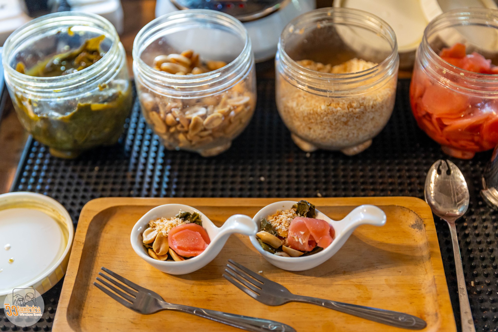 ที่ร้านใบเหมี้ยงปรับสูตรการทานเหมี้ยงโดยนำมาใส่ขิงดอง ถั่วลิสง มะพร้าวคั่ว และใส่น้ำผึ้งเพื่อลดทอนความเปรี้ยวและฝาด แนะนำให้ทานพร้อมกันในคำเดียว รสชาติและกลิ่นของใบเหมี้ยงกระโดดผ่านมะพร้าว ถั่ว ขิงมาเตะลิ้นเข้าเต็มๆ...อืม ขนาดปรับมาขนาดนี้ยังทานยากเลย ใครไปเที่ยวป่าเหมี้ยงลองทานดูครับ ประสบการณ์ใหม่