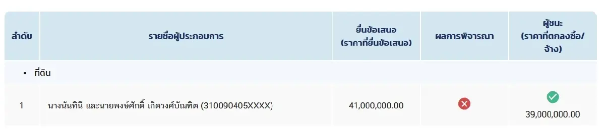 ขั้นตอนการยื่นข้อเสนอราคา มีนางนันทินี และนายพงษ์ศักดิ์ เกิดวงศ์บัณฑิต ยื่นข้อเสนอแค่รายเดียว วงเงิน 41 ล้านบาท เบื้องต้นไม่ผ่านการพิจารณา ต่อมา สปส.ตกลงซื้อขายที่ดินด้วยวงเงิน 39 ล้านบาท (ดูภาพประกอบ)