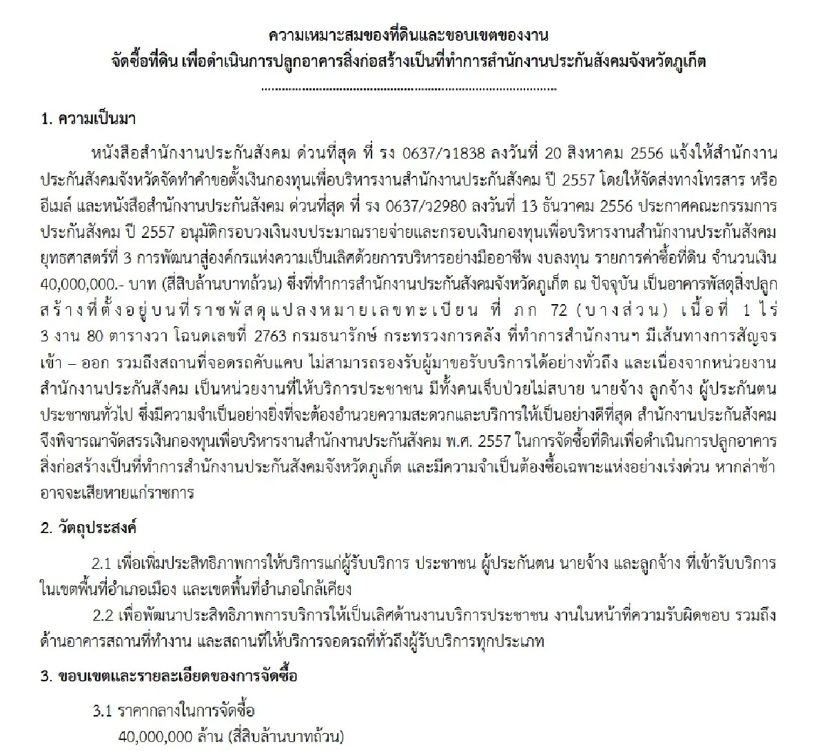 ทั้งนี้การซื้อที่ดินเพื่อปลูกสร้างสำนักงานประกันสังคมจังหวัดภูเก็ต มีการจัดซื้อจัดจ้างถึง 2 ครั้ง ครั้งแรกปีงบประมาณ 2556 มูลค่า 14.8 ล้านบาท และปีงบประมาณ 2557 มูลค่า 39 ล้านบาท รวม 53.8 ล้านบาท