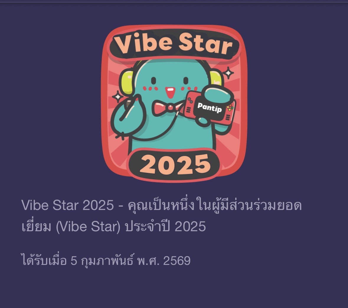 นั่งเล่นพันทิป ตอบกระทู้บ้างตั้งกระทู้บ้าง ก็มีเสียง เมล์ดังขึ้นมา เขาไปดู เขาบอกว่า " ยินดีด้วยค่ะ คุณเป็นหนึ่งในผู้มีส่วนร่วมยอดเยี่ยม (Vibe Star) ประจำปี 2025" เย้ เย้ เย้ ......
