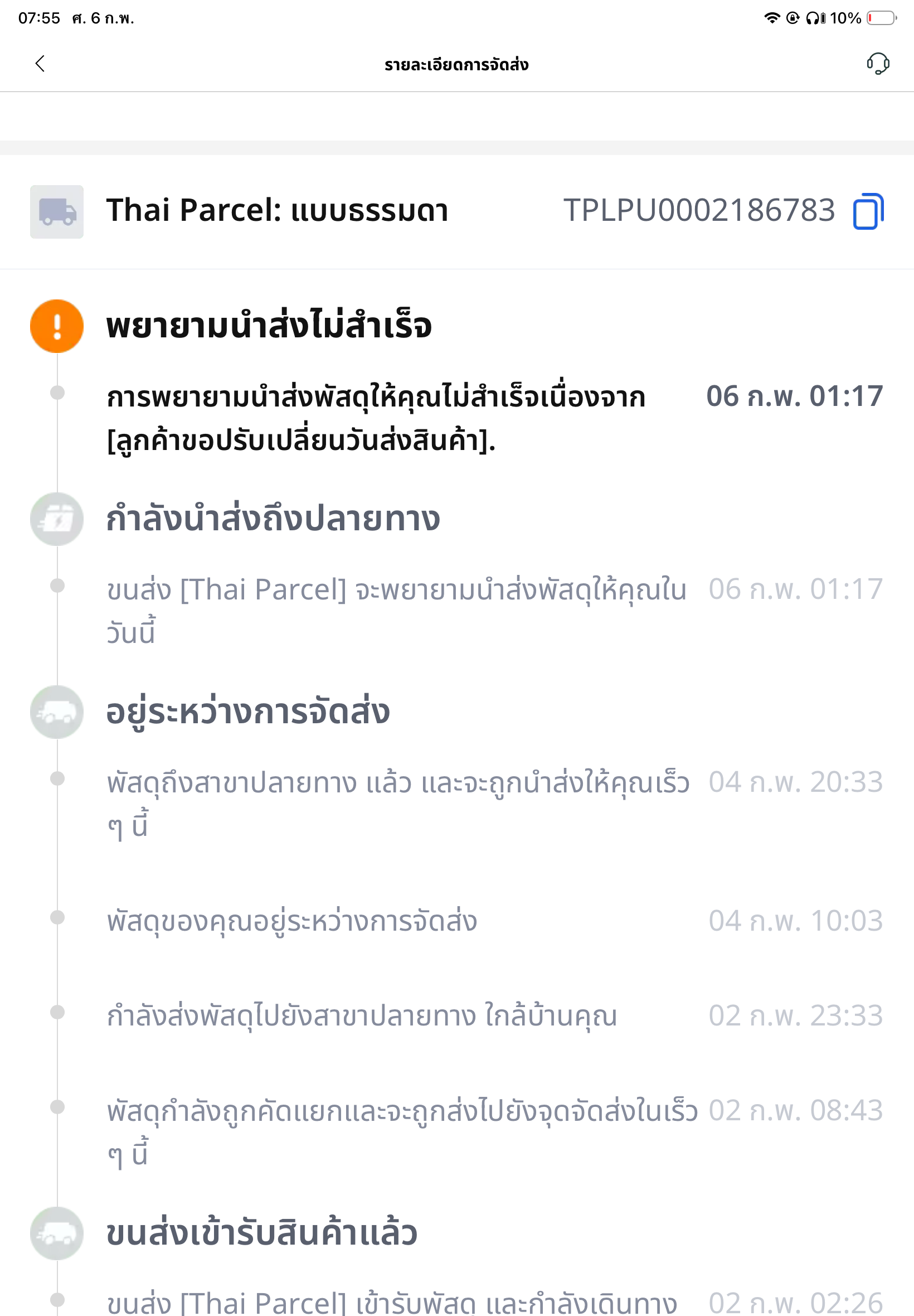 สั่งของจาก Lazada ช่วง 2.2 เป็นทีวี LG 55 นิ้ว ในแอพระบุว่า จัดส่งภายในวันที่ 6 ก.พ. 2569 จัดส่งโดยบริษัท Thaipacel แต่พอเช้าเข้าไปดู บอกว่าเราเลื่อนจัดส่ง ทั้งที่ไม่มีพนักงานโทรมาเลย เสียความรู้สึกแล้วค่ะ ไม่อยากรับสินค้าชินนี้แล้ว รบกวนยกเลิกให้หน่อยค่ะ
