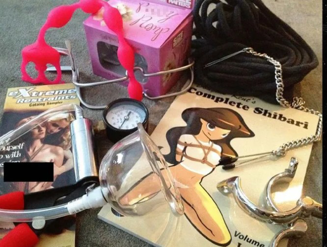 แล้วก็มีภาพ ซึ่งแสดงให้เห็นถึงรสนิยมทางเพศที่แปลกประหลาด... ในภาพมีนิตยสาร "Extreme Restraints" ที่มีภาพผู้หญิงเปลือยกายถูกมัดอยู่บนปก นอกจากนี้ยังมีเชือกสีดำเส้นใหญ่ โซ่สีเงินเส้นหนา กุญแจมือ ลูกปัดสีชมพูสำหรับใช้ทางทวารหนัก และกล่อง "Pussy Pump" ที่มีผลิตภัณฑ์รูปทรงคล้ายถ้วยดูดที่ดูแปลกประหลาดวางโชว์อยู่ด้วย