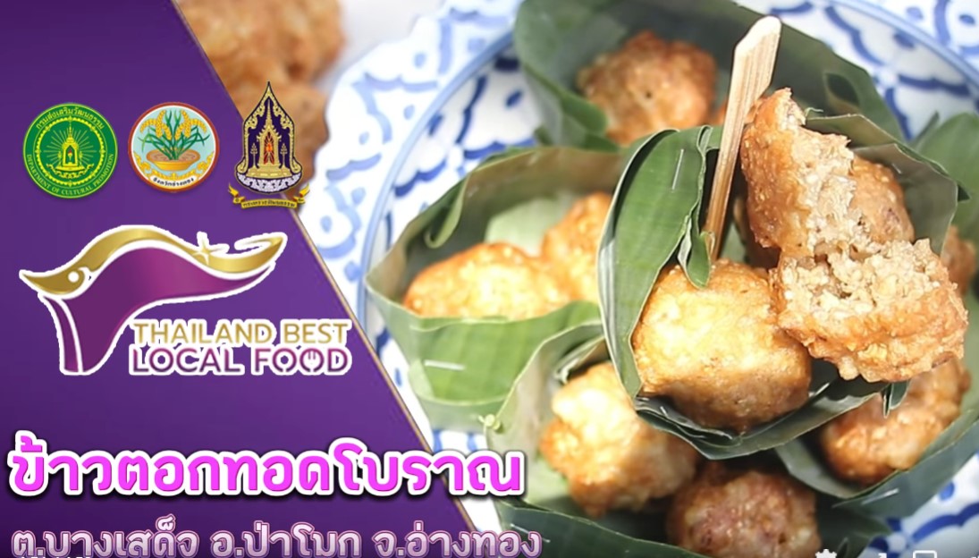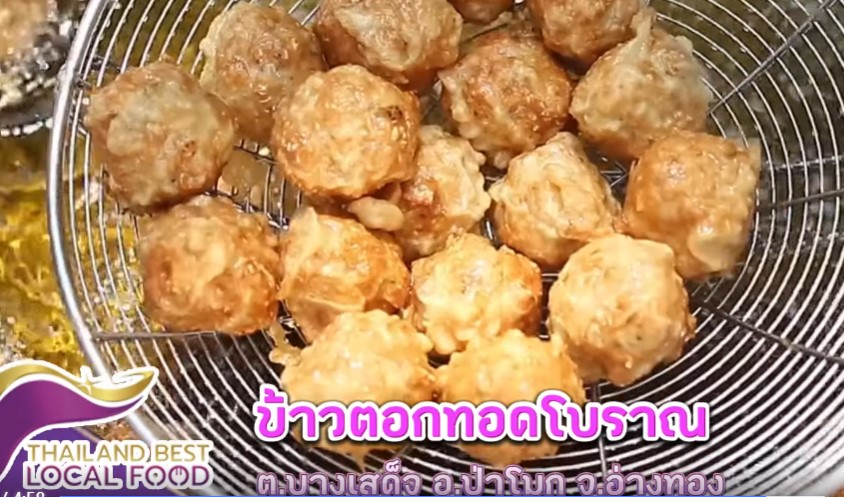 ขนมข้าวตอกทอดโบราณ... เมนูนี้เกิดจากความอุดมสมบูรณ์ของท้องนา ผสมผสานกับภูมิปัญญาชาวบ้านบางเสด็จ อ่างทอง ที่นำข้าวเปลือกมาคั่วจนหอมกรุ่น แล้วนำมาคลุกเคล้ากับกะทิสด น้ำตาลมะพร้าว และงาคั่ว ก่อนจะปั้นเป็นก้อน ชุบแป้งผสมไข่ขาว แล้วนำไปทอดจนเหลืองกรอบน่ากิน