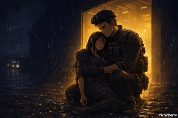 ราฟาเอลและทีมปฏิบัติการเข้าประจำการในชุดภาคสนามเต็มรูปแบบ อาวุธครบมือ เสื้อเกราะแนบลำตัว เสียงลมหายใจถูกกลืนหายไปกับเสียงฝนที่ตกกระทบหลังคาโลหะ