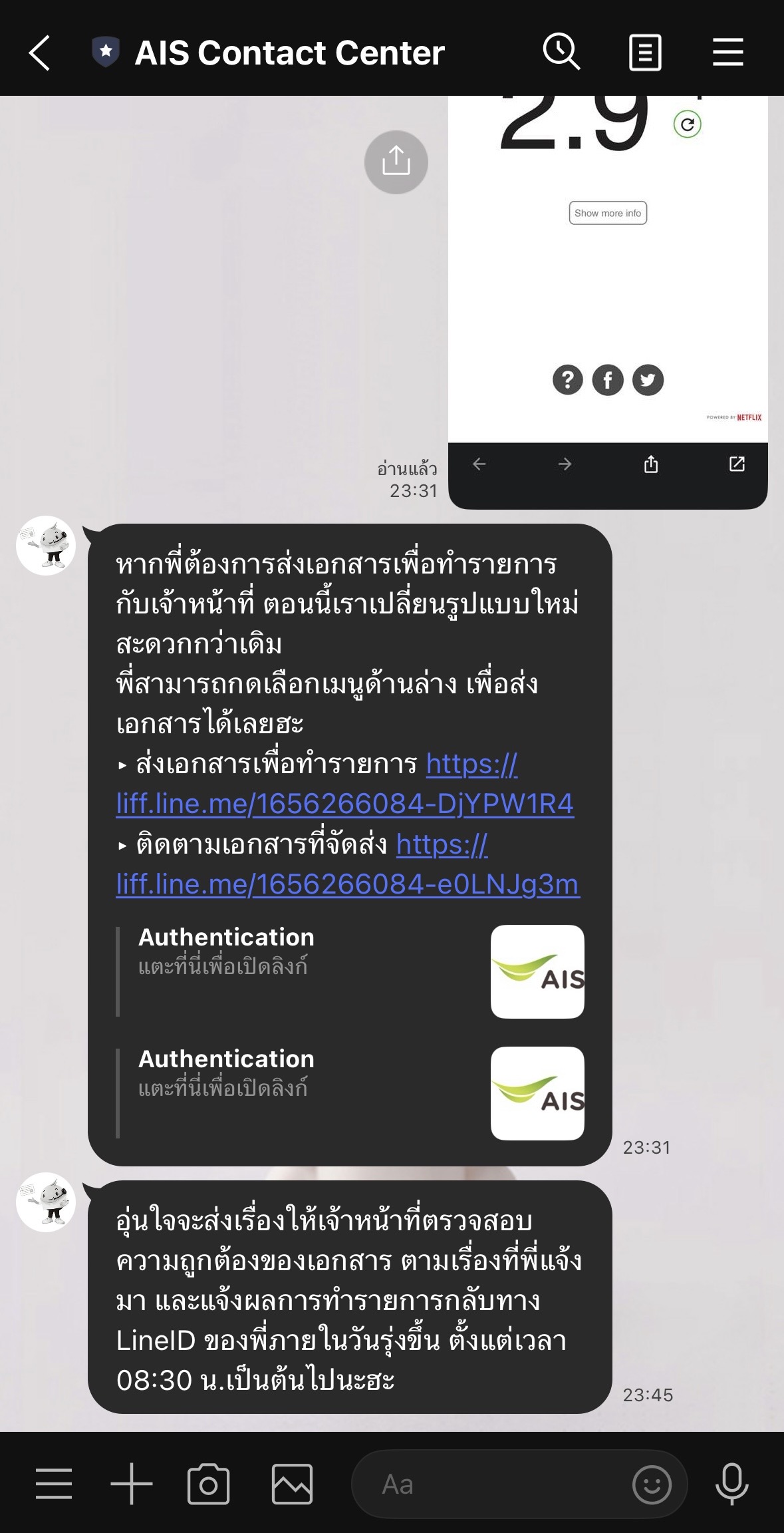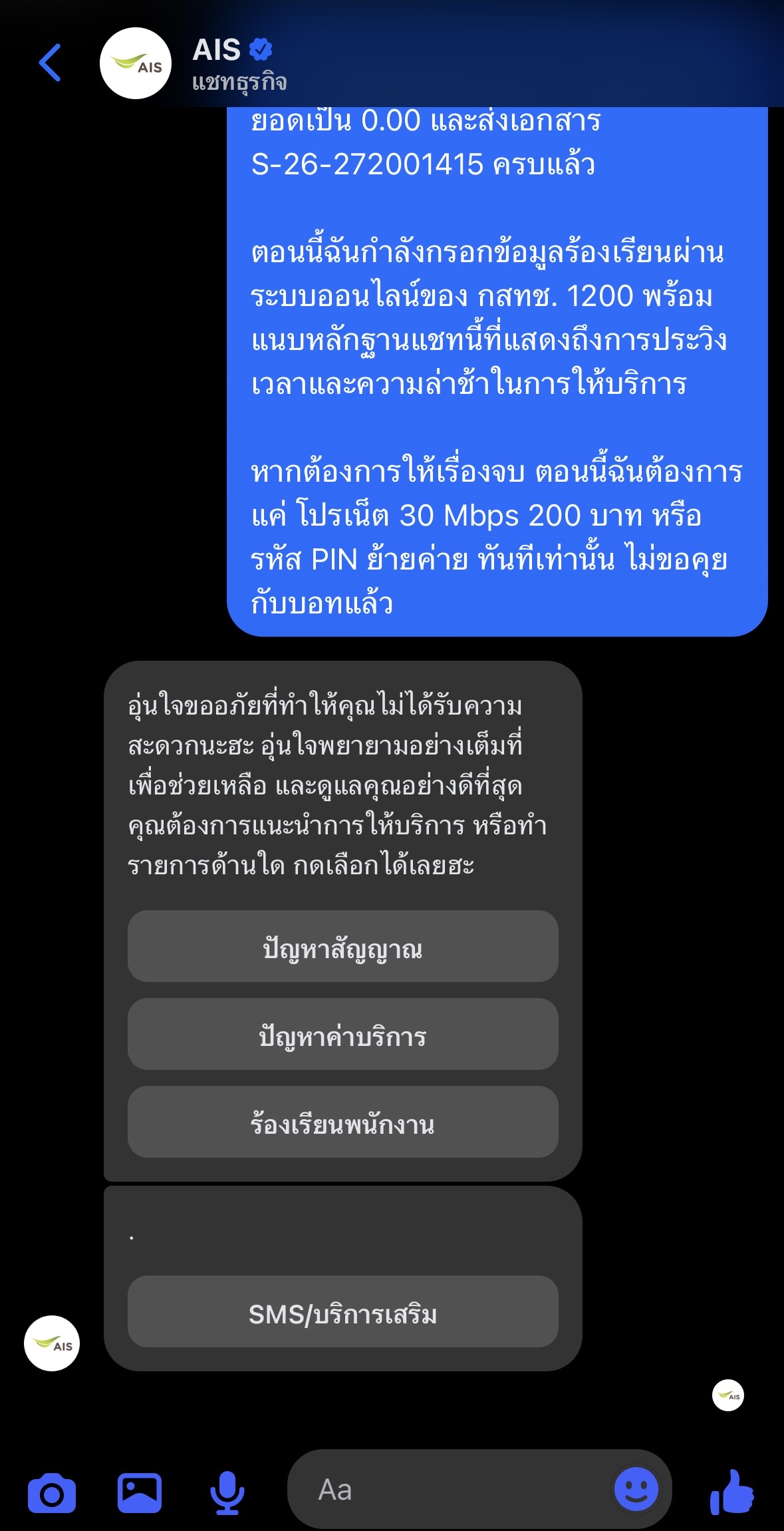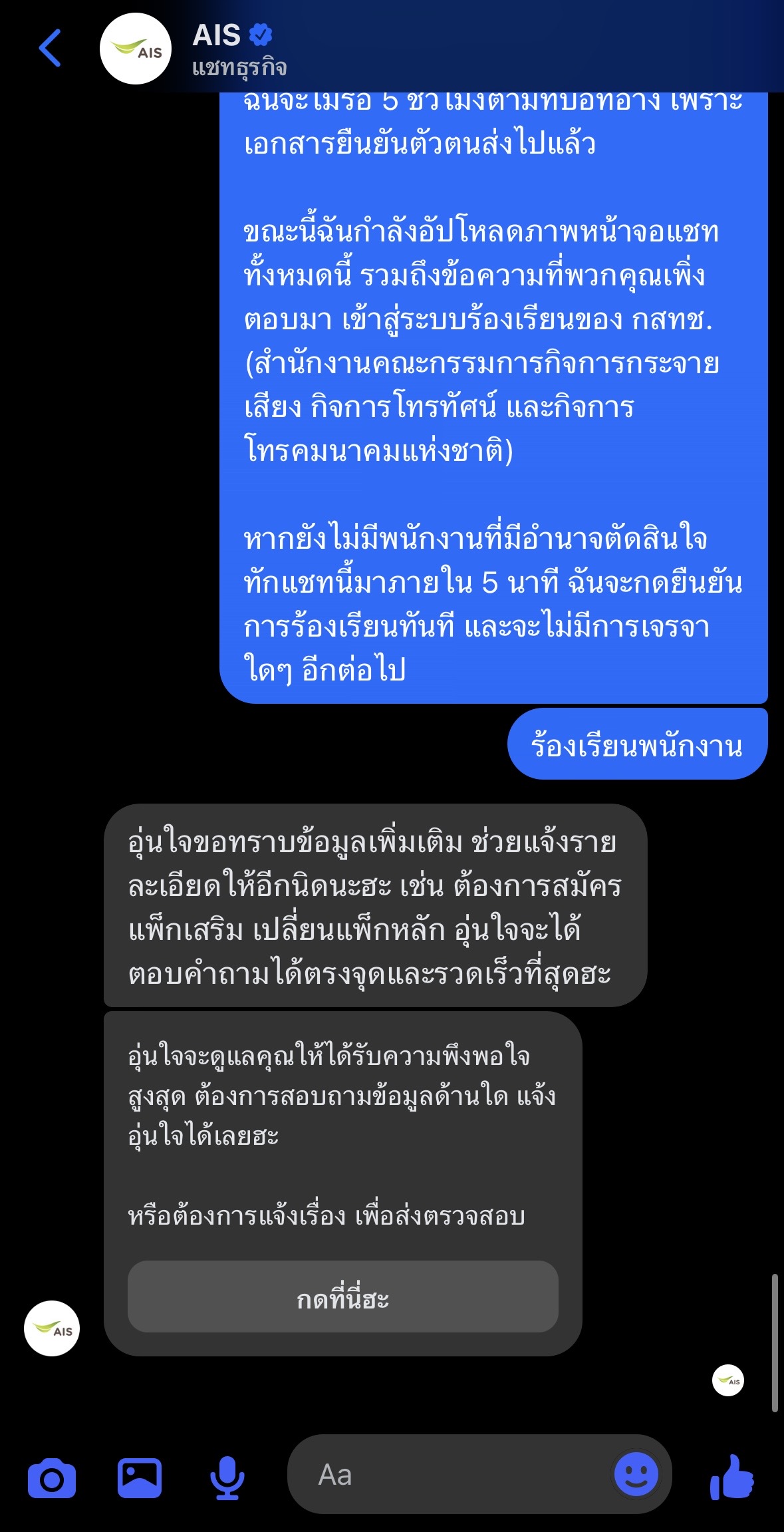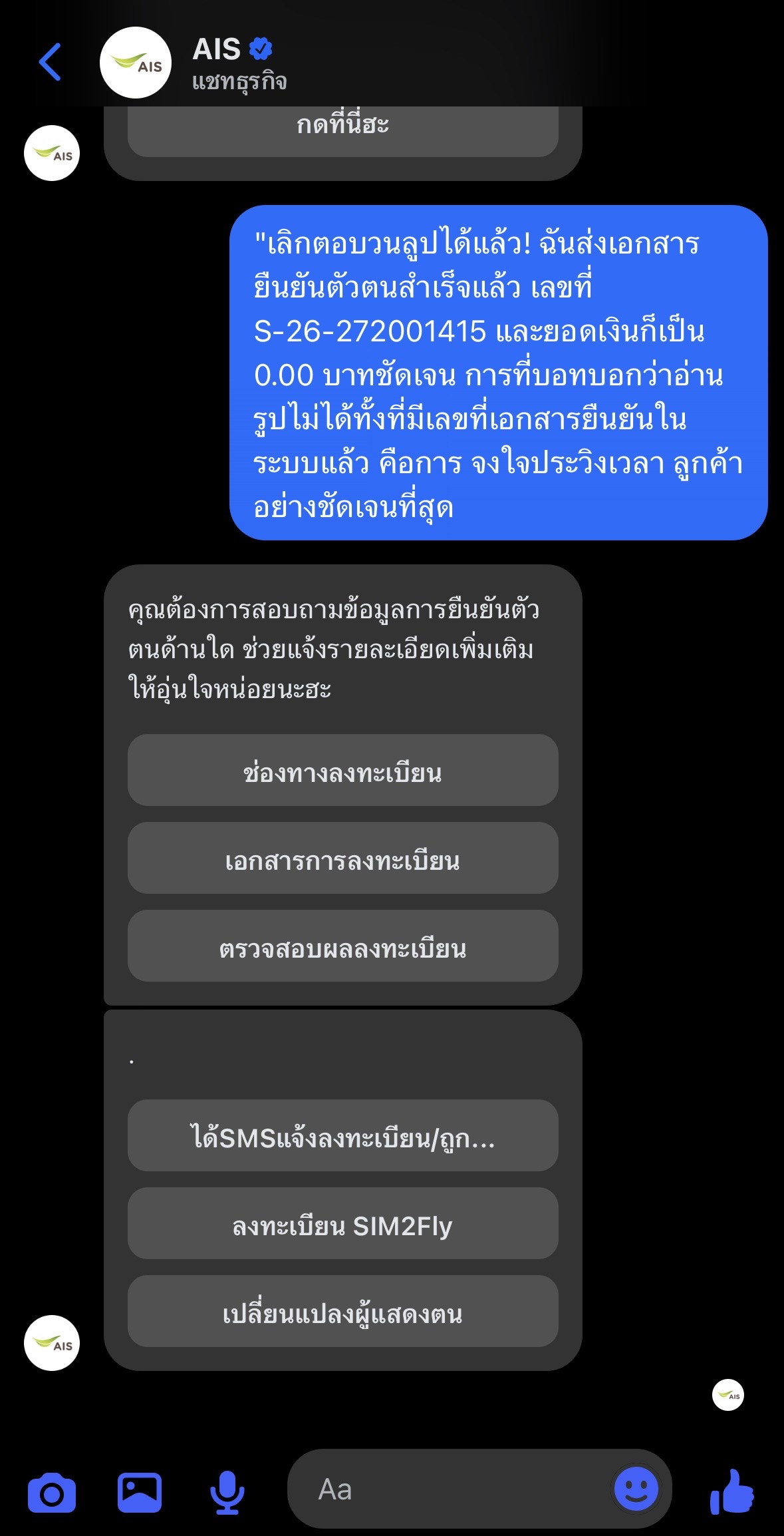2. ปัญหาการบริการ: ระบบอัตโนมัติ (บอท) ในแชทไม่สามารถดำเนินการต่อได้ โดยอ้างว่าอ่านรูปไม่ได้ ทั้งที่มีเลขที่เอกสารยืนยันในระบบแล้ว และยังไม่มีเจ้าหน้าที่ติดต่อกลับเพื่อส่งมอบรหัส PIN ย้ายค่าย