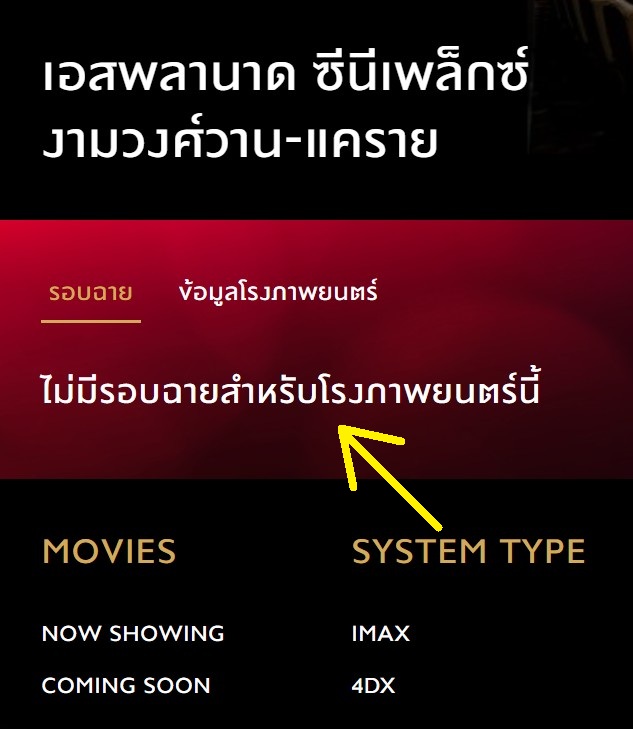 วันพุธที่ผ่านมาจะเข้าไปเช็กรอบฉาย ปรากฏว่าขึ้นข้อความแบบในภาพด้านล่างนี้ ก็คือ "ไม่มีรอบฉายสำหรับโรงภาพยนตร์นี้" Ok ก็คิดว่าคงปรับปรุงชั่วคราว ปรากฏวันต่อมาก็ยังไม่ได้ .... และล่าสุดเมื่อครู่นี้ก็ยังขึ้นแบบนี้