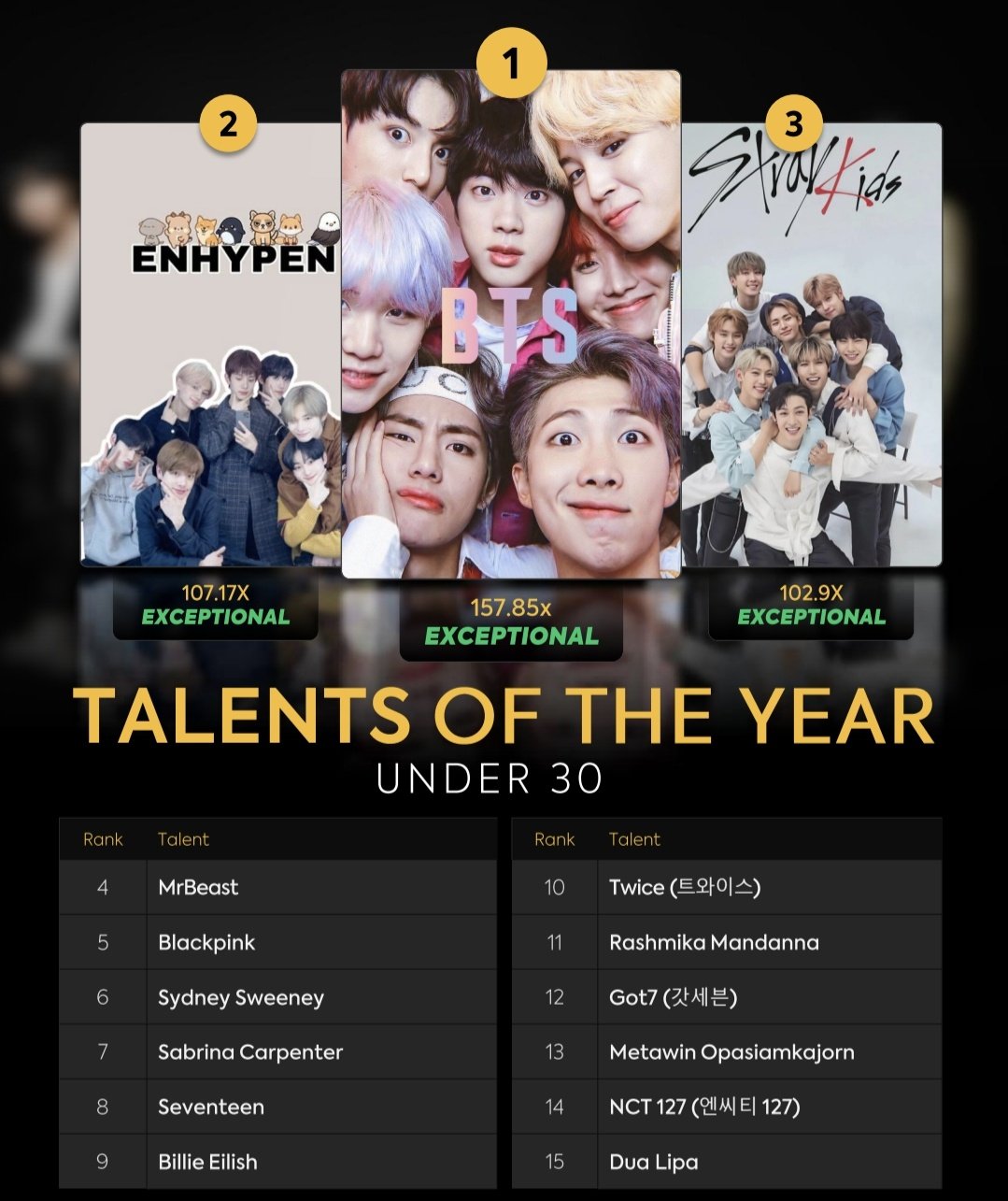 Parrot Analytics ระบุว่า BTS ครองอันดับ 1 ในหมวด “Talents of the Year Under 30” (บุคคลแห่งปีอายุต่ำกว่า 30 ปี) ในขณะที่ ENHYPEN ได้อันดับ 2 และ SEVENTEEN ได้อันดับ 8 ตามลำดับ