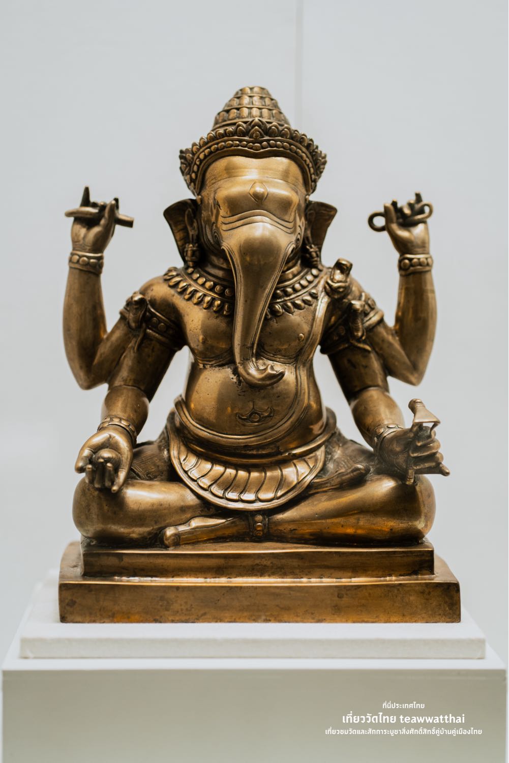 หล่อด้วยโลหะสำริดและทองเหลือง ผิวเรียบมัน แสดงฝีมือช่างอย่างประณีต ประทับนั่งขัดสมาธิบนฐานสี่เหลี่ยม พระเศียรเป็นเศียรช้าง งวงยาวโค้งอ่อนช้อย ใบหูใหญ่ สวมมงกุฎและเครื่องประดับแบบอินเดียโบราณ เช่น สร้อยคอและกำไล แสดงฐานะของเทพเจ้า