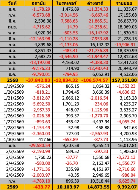Sinthorn Summary : 2/2/2569 : ต่างชาติขายสุทธิ -297.33 ลบ.