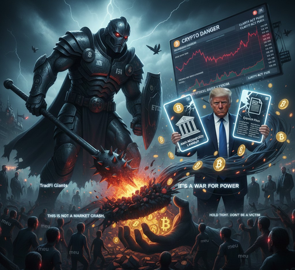 กลุ่มทุนยักษ์ใหญ่ (เช่น ธนาคาร หรือกองทุน ETF) กำลังใช้กลยุทธ์ทุบราคาเพื่อสร้างภาพว่า "คริปโตอันตราย" เป้าหมายเพื่อล็อบบี้ให้รัฐบาลเขียนกฎหมาย Clarity Act ให้เอื้อประโยชน์แค่พวกตนเอง เช่น ให้ธนาคารเท่านั้นที่มีสิทธิ์ถือคริปโต หรือออก Stablecoin แผนการทุบราคาในกระดาน ETF ให้คนตกใจขาย แล้วแอบไป "ช้อนซื้อ" ของถูกในตลาด Spot เก็บไว้เอง เพื่อรอกินรวบตอนกฎหมายผ่าน
