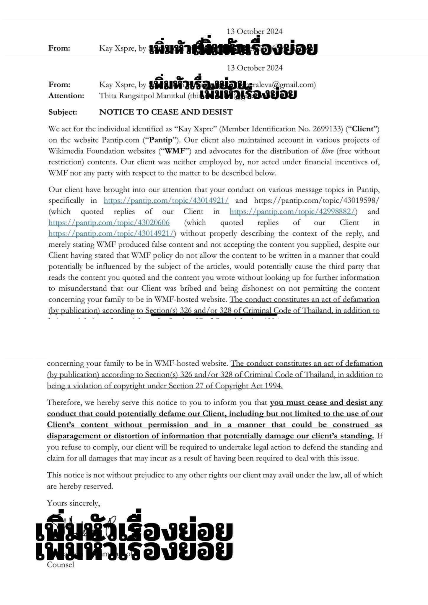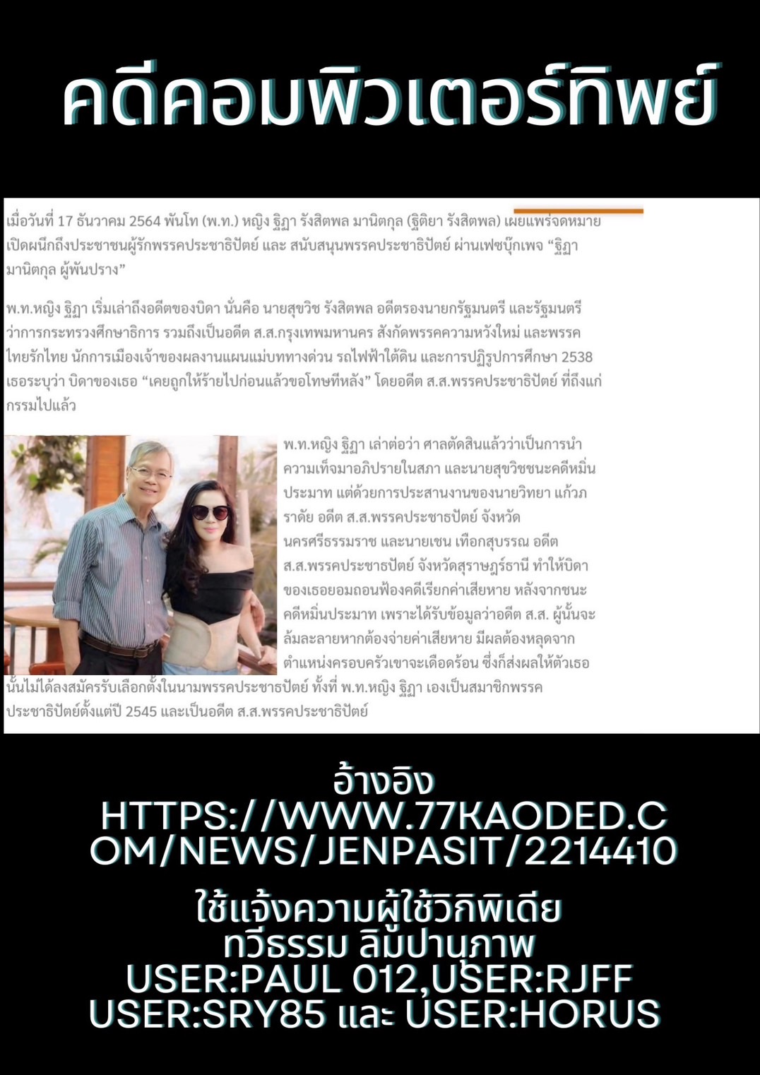 คดีนำเข้าข้อมูลเท็จในระบบคอมพิวเตอร์ของผู้ใช้วิกิพิเดีย เหตุใดยังไม่ถูกจับครับ?