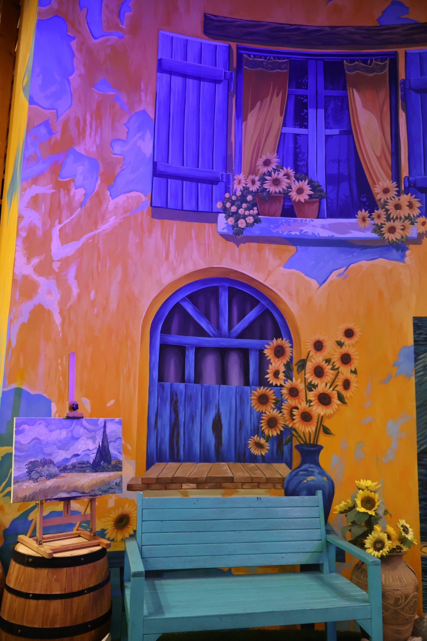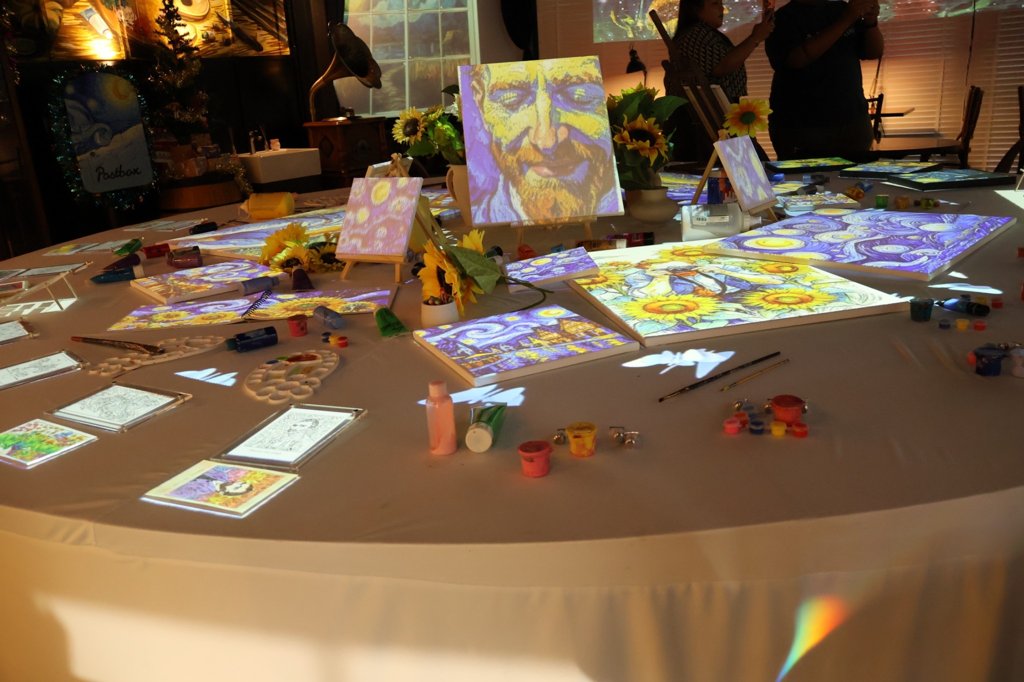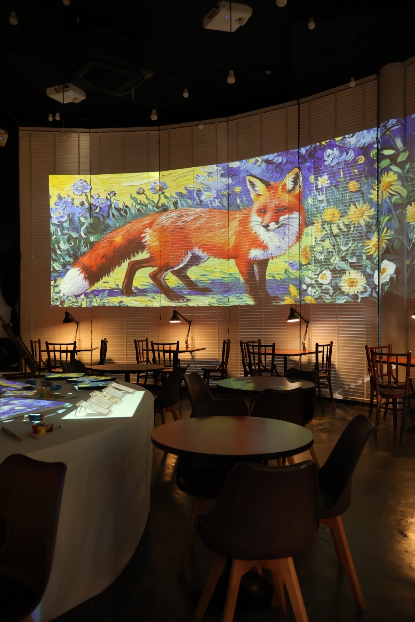 ร้านนี้เขาตกแต่งแบบจัดเต็มมาก ชั้นล่างคือไฮไลท์เลย มีการใช้เทคนิคฉายภาพวาดลงบนผนังแบบรอบทิศทาง ฟีลเหมือนหลุดเข้าไปอยู่ในภาพวาด