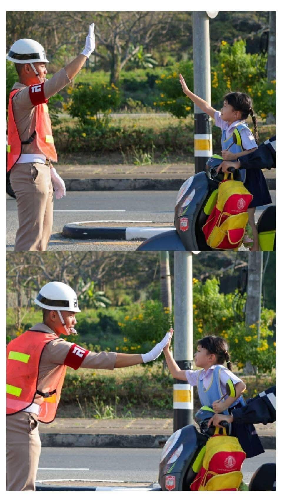 แต่แล้วความน่ารักก็เกิดขึ้น! เมื่อหนูน้อยตัวจิ๋วที่นั่งซ้อนท้ายรถจักรยานยนต์ผ่านมา มองเห็นมือที่ชูขึ้นมานั้นไม่ใช่คำสั่งให้หยุด แต่เป็นคำชวนมาแตะมือกัน! หนูน้อยเลยยื่นมือเล็ก ๆ ไป "Give me five" ตอบกลับพี่ทหารแบบเต็มรัก ซอฟต์พาวเวอร์ความไร้เดียงสานี้ ทำเอาพี่ทหารใจละลาย ยิ้มกว้างออกมาทันทีเลยค่ะ