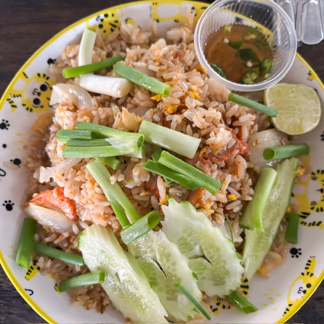 เค้ามีพวกข้าวผัด ก๋วยเตี๋ยวด้วย ข้าวผัดนี่คือ ข้าวผัดแบบไทยแท้ๆ เลย ข้าวผัดในโรงเรียน ข้าวผัดในงานทำบุญ อร่อย