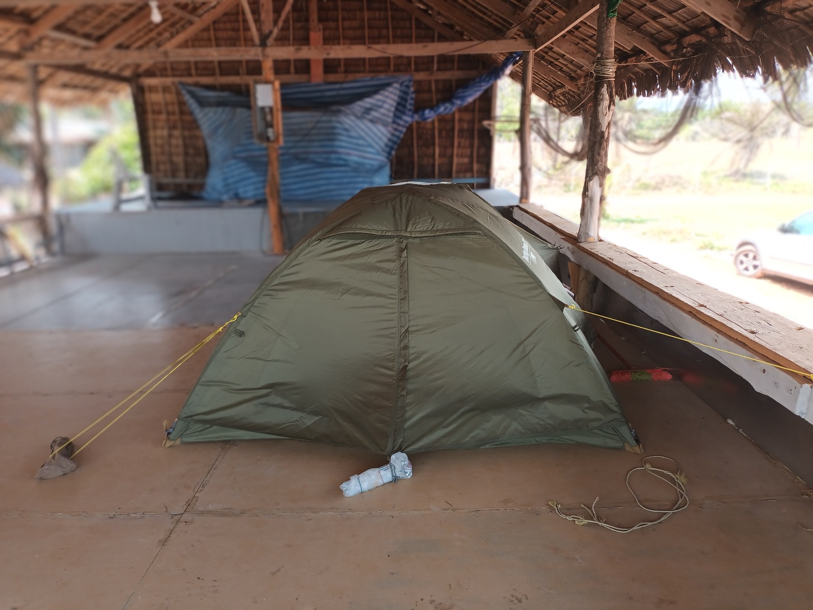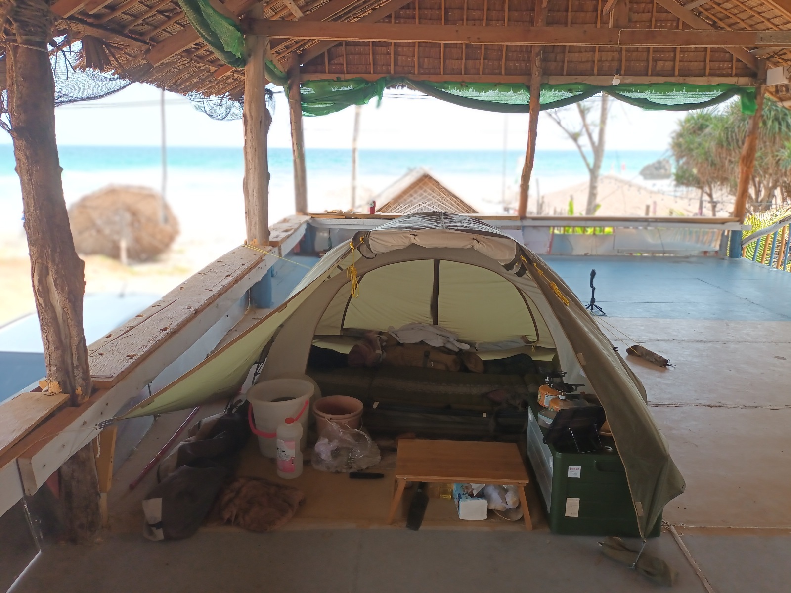 ยอมกางบนเรือนโล่ง จอดรถขนของเกือบสิบเมตร เดินขึ้นบันไดไม้ 7 ขั้นได้ กางเต็นท์หันหลังให้ชายหาด เพื่อกันลม นั่งอีกด้าน จะได้ทำครัวได้ง่าย แล้วค่อยยกไปนั่งทำทรงด้านหน้าครับ