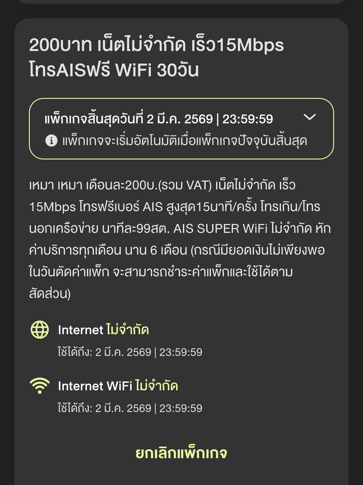 ต้องการยกเลิกแพ็คเกจ AIS