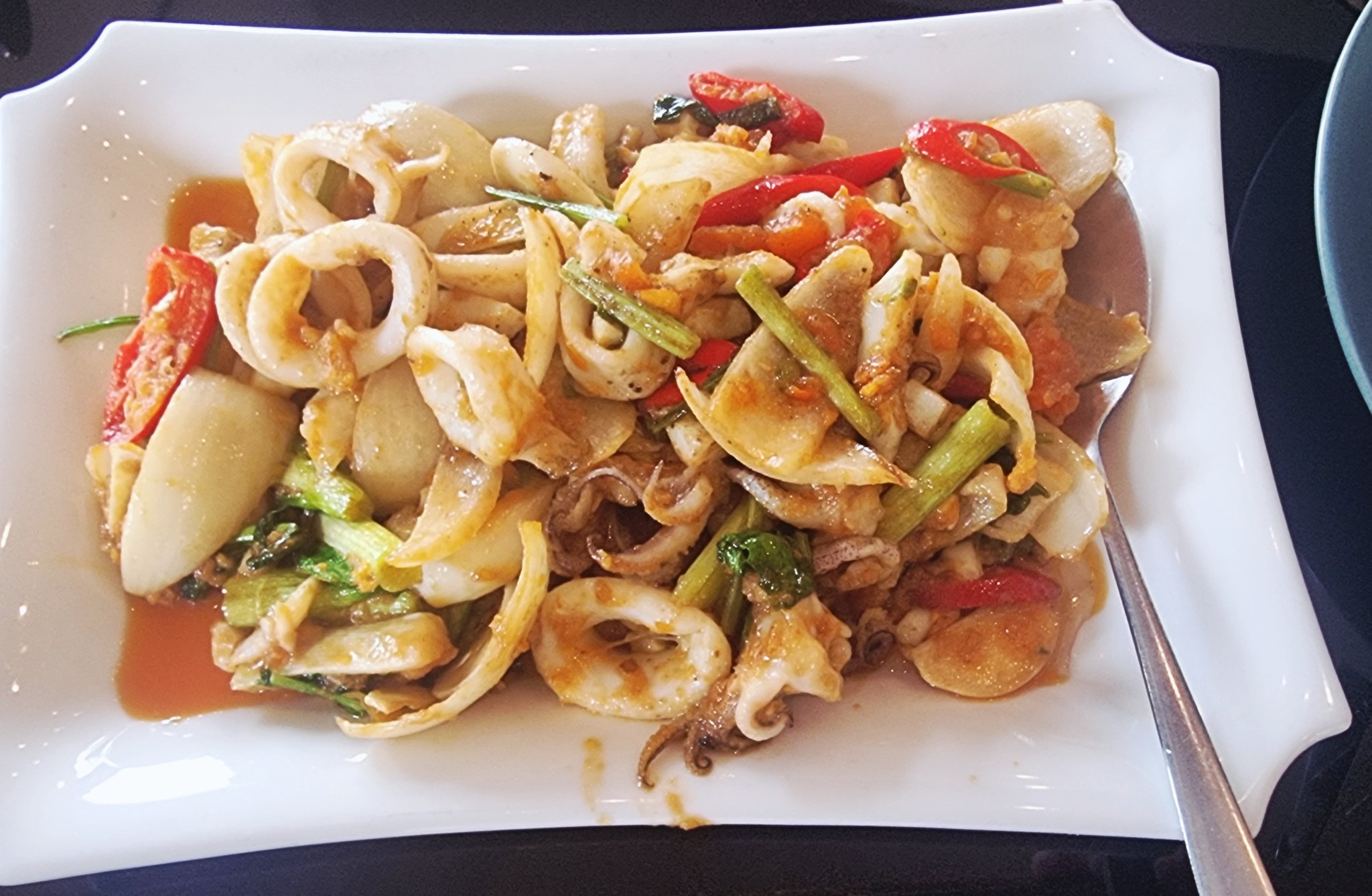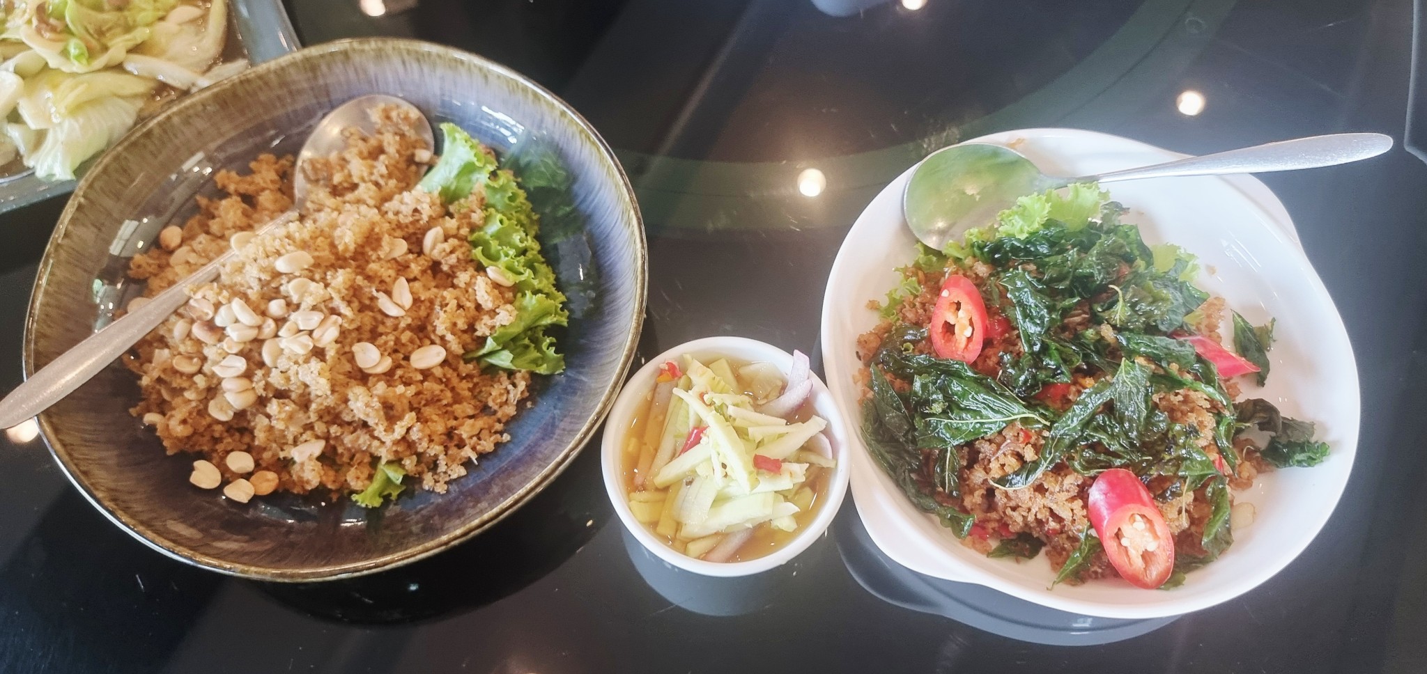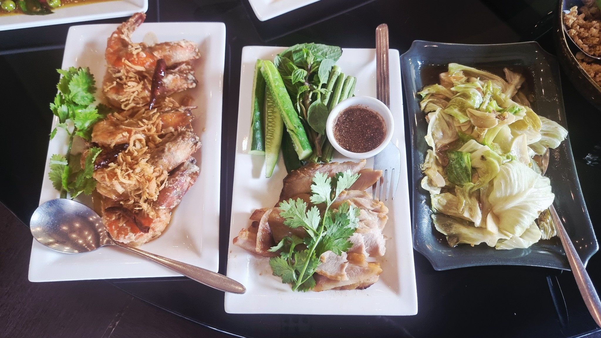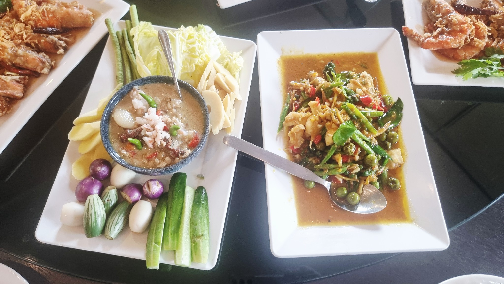 กุ้งซอสมะขาม (ให้ได้ 9 คน ) ,ทอดมันปลากราย 2 ชุด, คอหมูย่าง 2 ชุด, เนื้อปลาผัดฉ่า 1 ชุด, ยำถั่วพลู 1 ชุด, ยำปลาดุกฟู 1 ชุด , ปลาดุกฟูผัดใบกระเพรากรอบ 1 ชุด , กะหล่ำปลีผัดน้ำปลา 1 ชุด, ปลาหมึกผัดไข่เค็ม 1 ชุด, หลนปูเค็ม 1 ชุด , ต้มข่าไก่ 1 ชาม , แกงส้มชะอมกุ้ง 1 ชาม