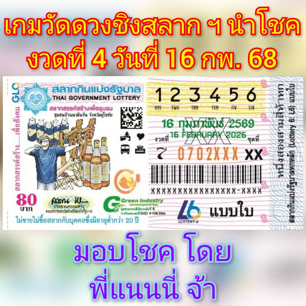 รางวัล :- สลาก ฯ นำโชค งวดที่ 4 วันที่ 16 กุมภาพันธ์ 2569 จำนวน 3 รางวัล ๆ ละ 3 ใบ และ กิตติมศักดิ์ 1 รางวัล คือ น้องนา จ้า