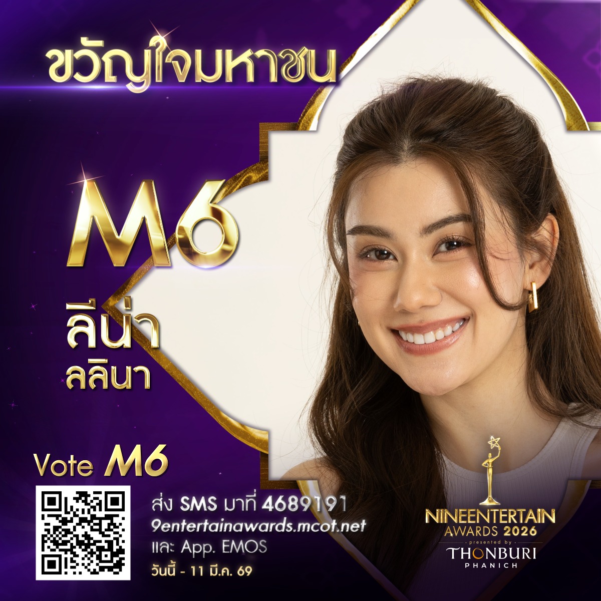 💜ร่วมโหวต “ลีน่า ลลินา” เป็น #ขวัญใจมหาชน บนเวทีอันทรงเกียรติ ไนน์เอ็นเตอร์เทน อวอร์ด 2026 พิมพ์ M6 ส่งมาที่ 4689191 (ครั้งละ 6 บาท) หรือโหวตผ่านทาง https://9entertainawards.mcot.net และ App. EMOS ตั้งแต่วันนี้ - 11 มี.ค. 2569.-ไนน์เอ็นเตอร์เทน
