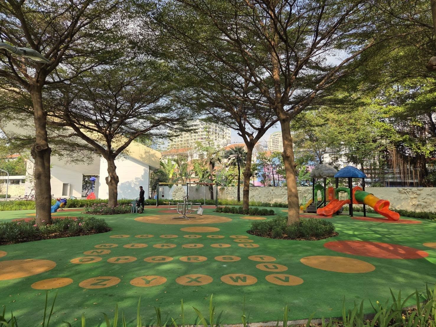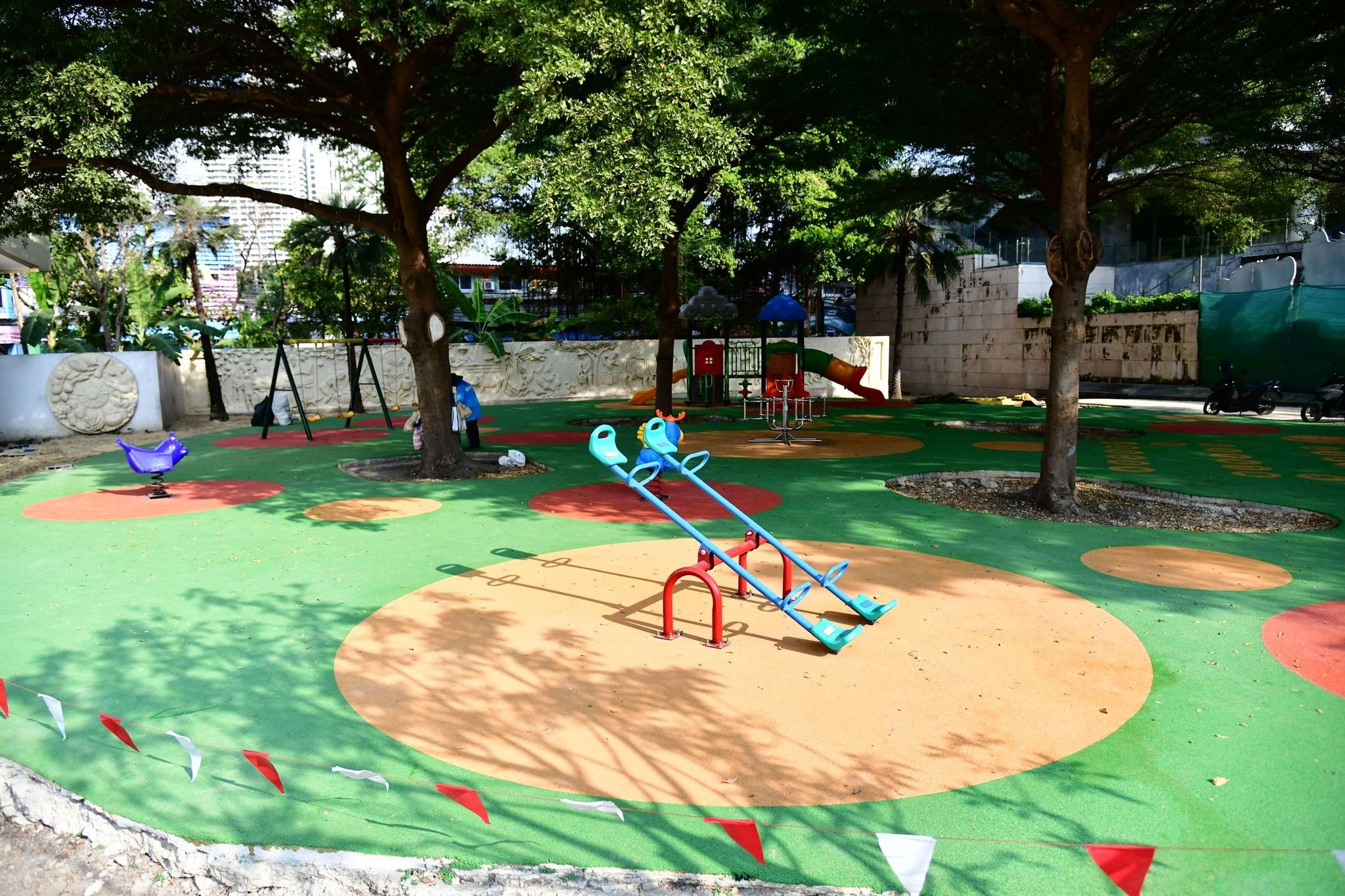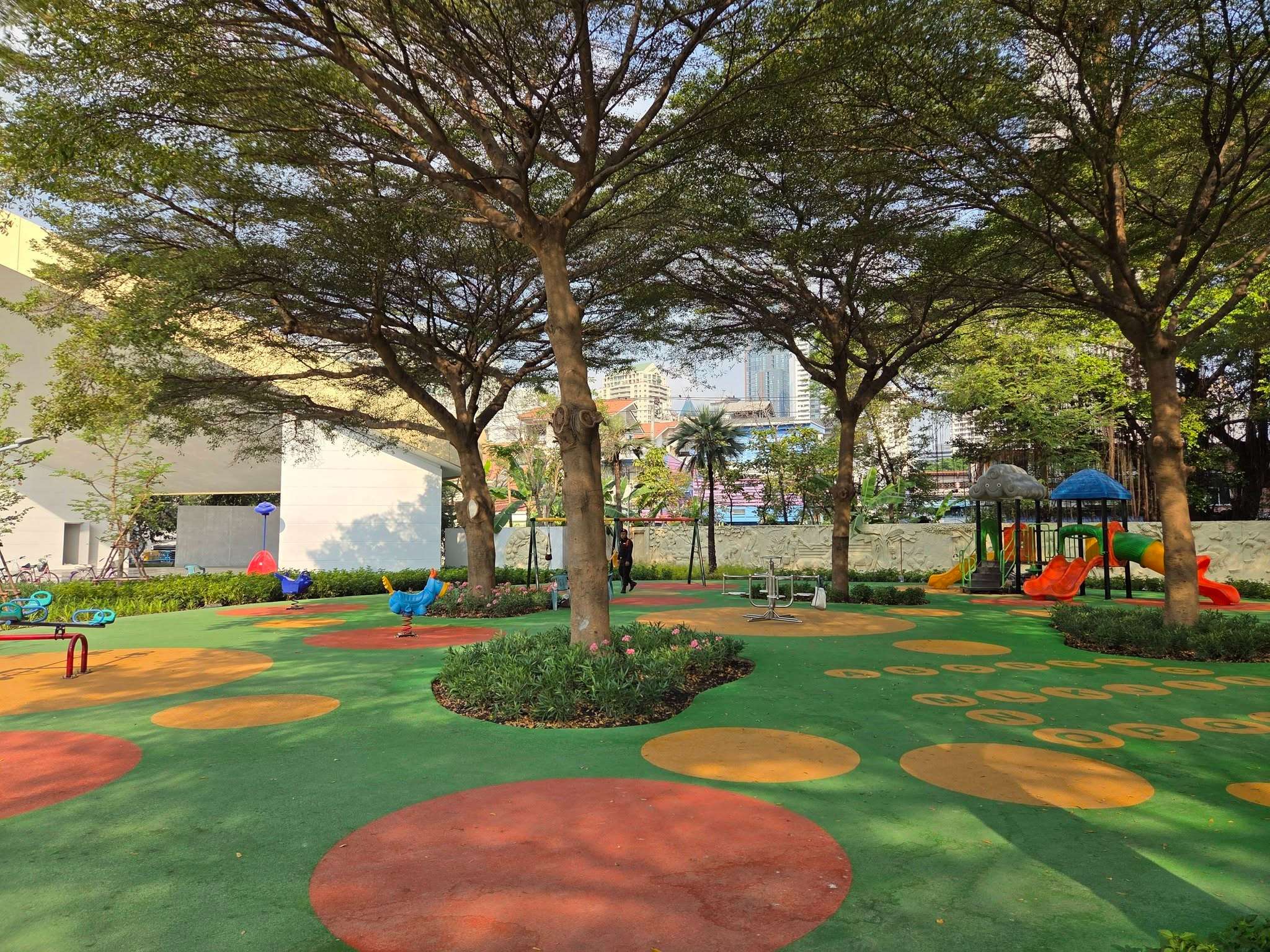 🌿 จากเดิมพื้นที่สีเขียวมีเพียง 26.1% ได้รับการปรับเพิ่มเป็น 40.4% หรือเพิ่มขึ้นเกือบ 4,000 ตร.ม. ด้วยการเพิ่มไม้ยืนต้น สนามหญ้า พืชน้ำ ลดพื้นที่ดาดแข็ง เพิ่มพื้นที่ซึมน้ำ และนำน้ำที่กักเก็บมาใช้ประโยชน์ ช่วยให้สวนร่มรื่น ใช้งานได้ตลอดทั้งวัน