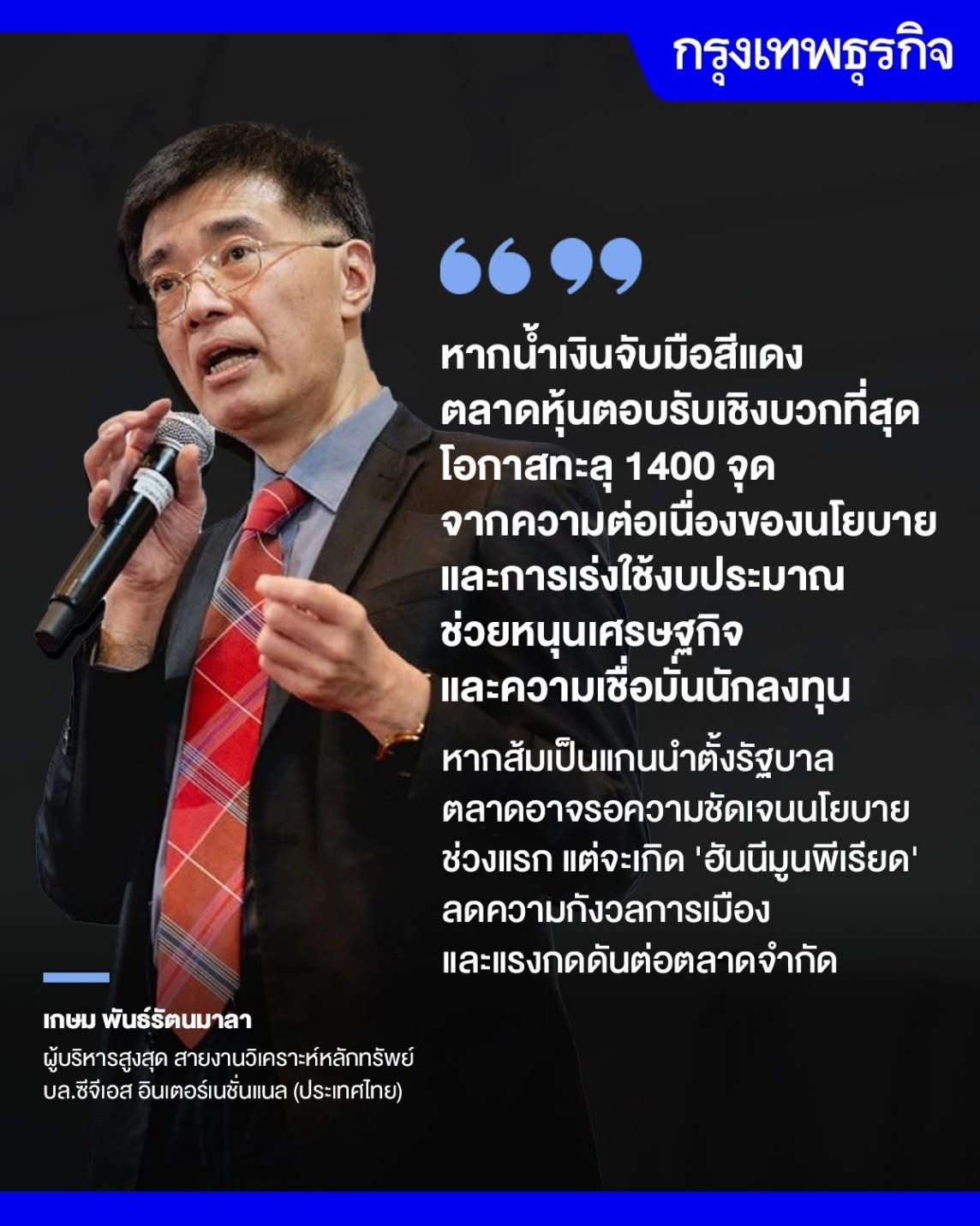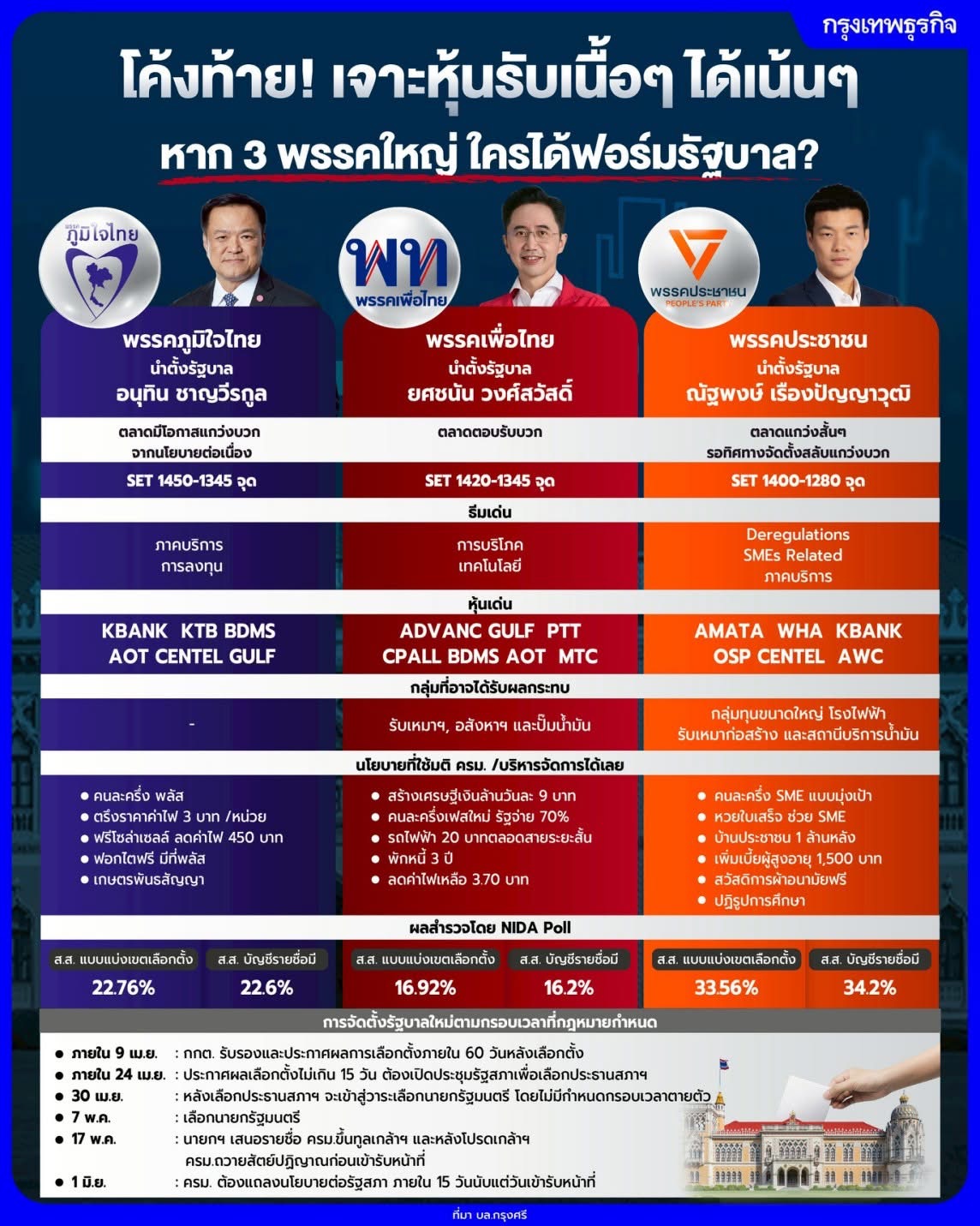 KEY POINTSตลาดหุ้นไทยได้รับปัจจัยหนุนจากความคาดหวังเชิงบวกต่อนโยบายกระตุ้นเศรษฐกิจหลังการเลือกตั้ง โดยเฉพาะมาตรการสนับสนุนการบริโภคและการเพิ่มรายได้ให้ครัวเรือน ซึ่งจะช่วยหนุนกำลังซื้อในประเทศ ตลาดได้