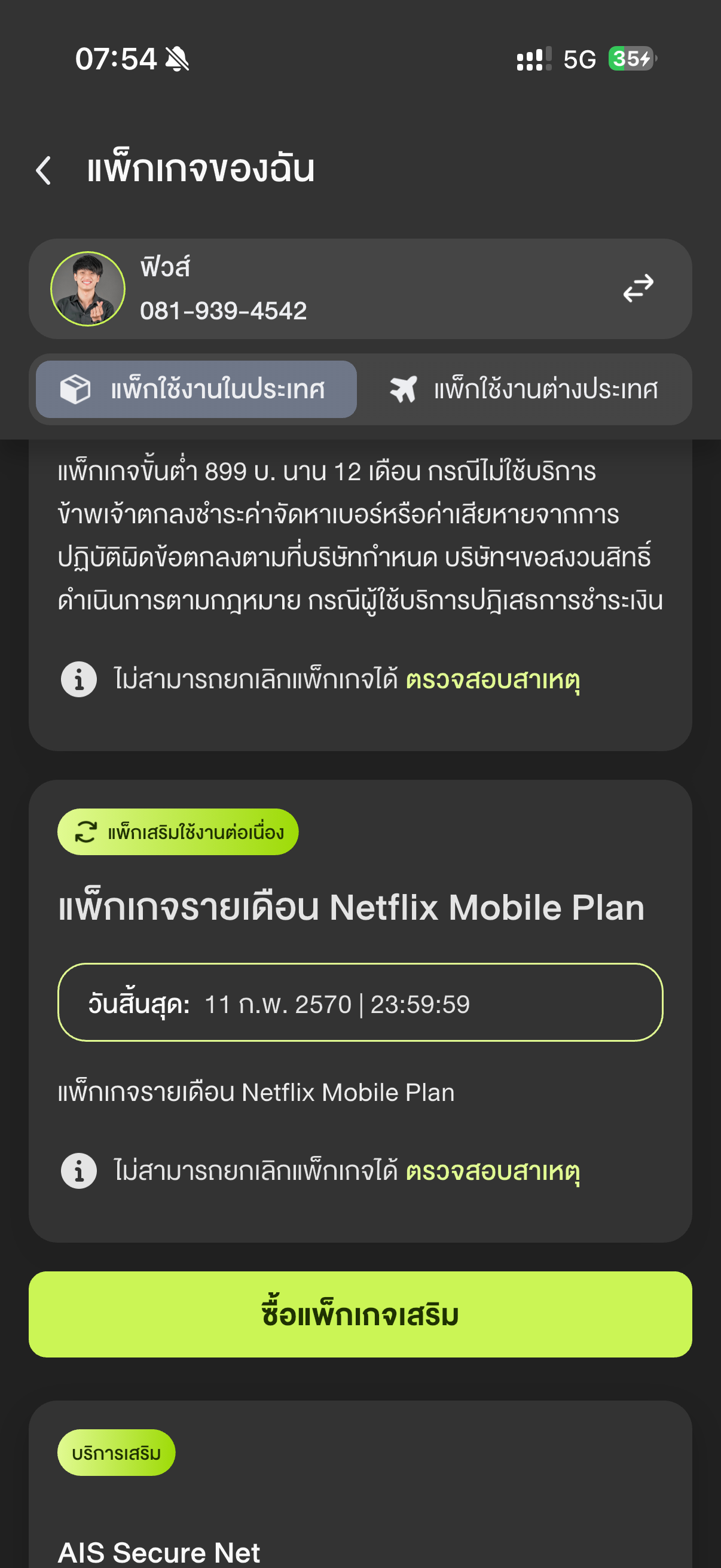 เนื่องจากเมื่อวันที่18ธันวาคม2568ได้ทำการ ยกเลิกแพ็คเกจNet extreme 1099เพื่อไปสมัคร5G max unlimited 1299 แต่เนื่องจากค่าบริการสูงไปทำให้เมื่อวันที่21ธันวาคม2568 ทำการยกเลิก5G max unlimited1299เพื่อไปส