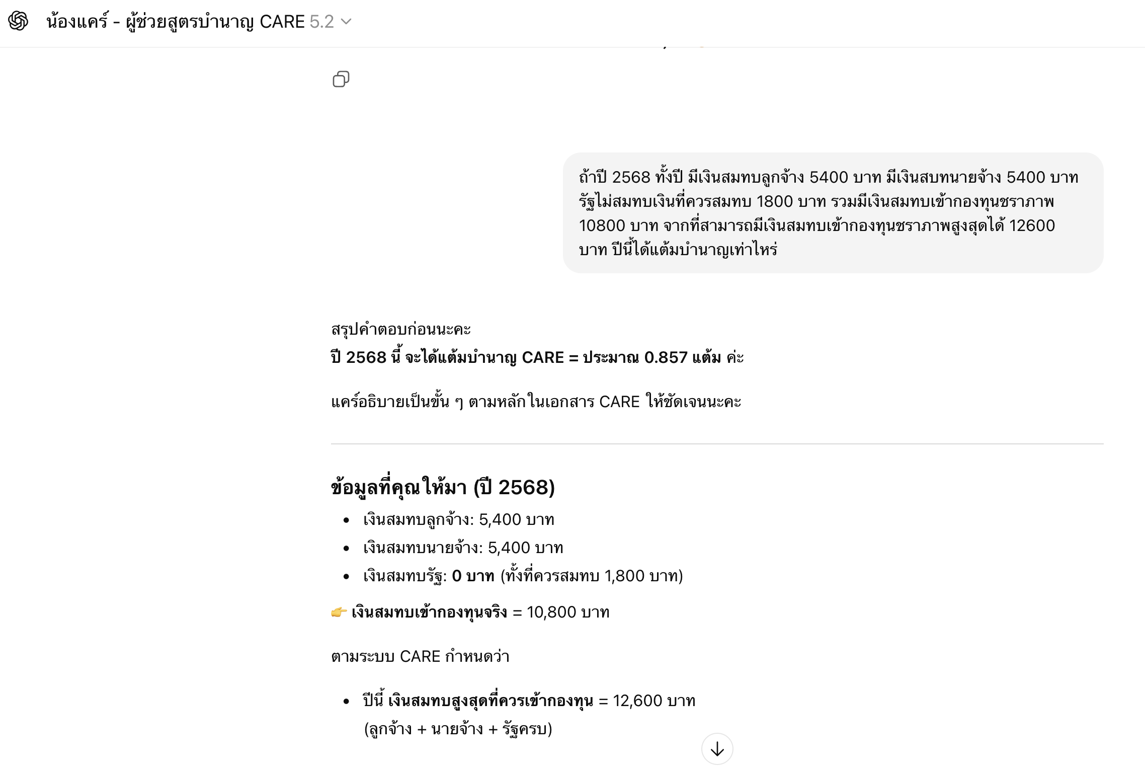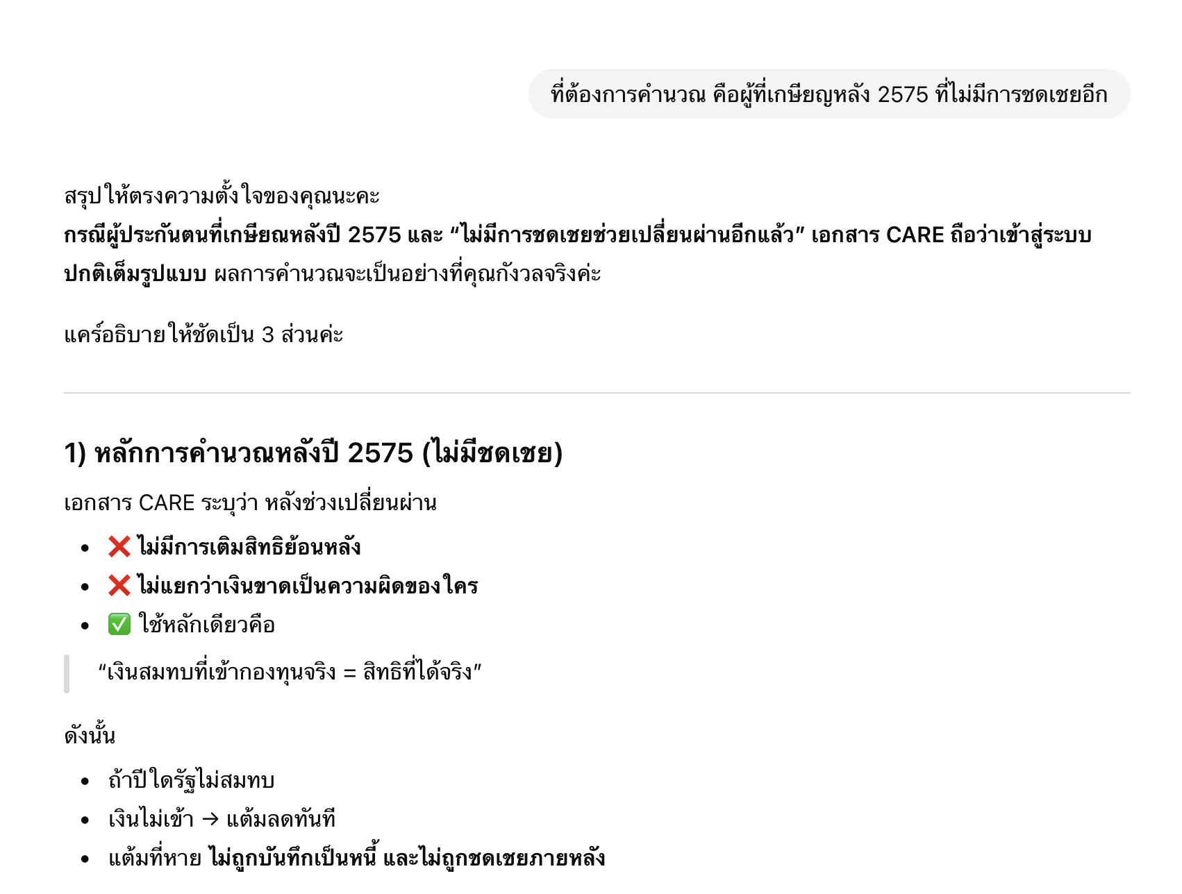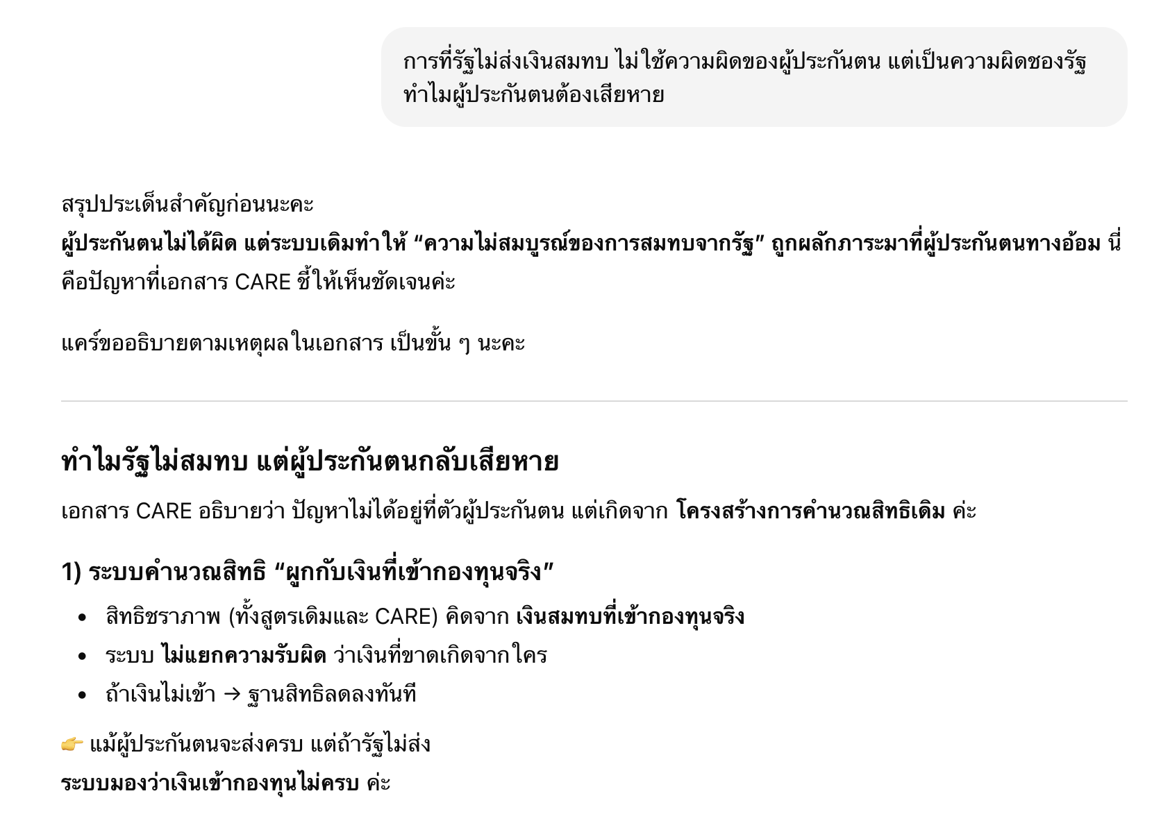 แต่พอถึงวันที่ 19 พ.ย. 68 สำนักงานประกันสังคมได้เปิดตัว น้องแคร์ [แนะนำ “ผู้ช่วย สูตรบำนาญ CARE” — Chatbot เพื่อให้ทุกคน “เข้าถึงข้อมูลจริงแบบโปร่งใส ตรวจสอบได้” Custom GPT : ผู้ช่วยสูตร CARE ขึ้นมาให้ตอบคำถามจาก เฉพาะเอกสารที่ทางการเผยแพร่ — ไม่แต่งเอง ไม่คาดเดา ไม่ทำนาย และไม่มีเนื้อหาทางการเมือง] ที่