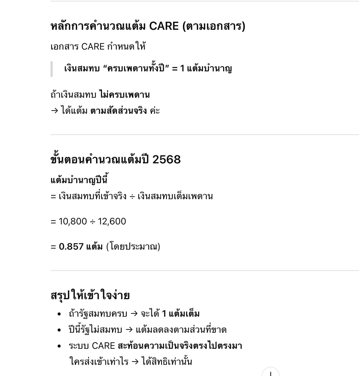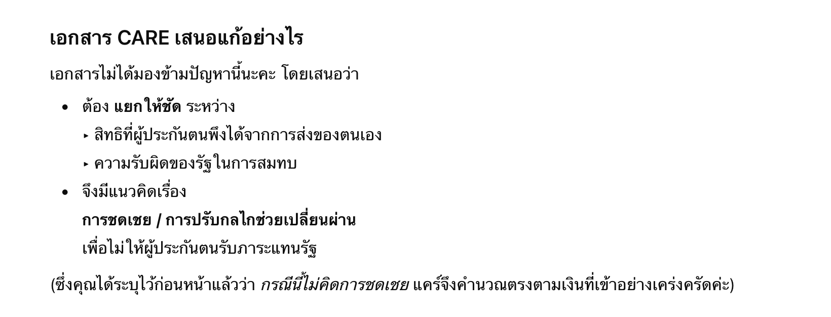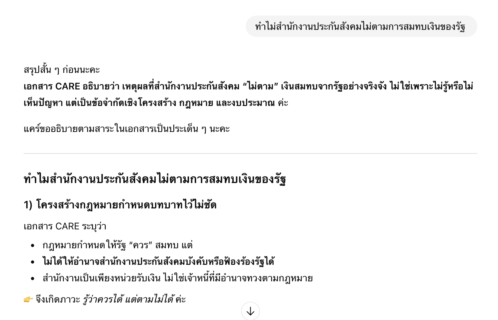 แต่พอถึงวันที่ 19 พ.ย. 68 สำนักงานประกันสังคมได้เปิดตัว น้องแคร์ [แนะนำ “ผู้ช่วย สูตรบำนาญ CARE” — Chatbot เพื่อให้ทุกคน “เข้าถึงข้อมูลจริงแบบโปร่งใส ตรวจสอบได้” Custom GPT : ผู้ช่วยสูตร CARE ขึ้นมาให้ตอบคำถามจาก เฉพาะเอกสารที่ทางการเผยแพร่ — ไม่แต่งเอง ไม่คาดเดา ไม่ทำนาย และไม่มีเนื้อหาทางการเมือง] ที่