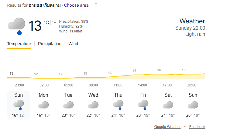 กรุงเทพมหานครตอนนี้ 30 องศา อุณหภูมิสูงสุด 32 องศา ในขณะที่ ฮานอย เวียดนาม ตอนนี้ 15 องศา อุณหภูมิสูงสุดของวันนี้เพียง 16 องศาเท่านั้น ช่างแตกต่างเหลือเกิน 2 เมืองหลวง
