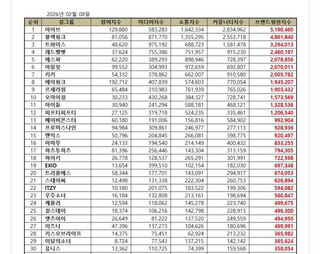 30 อันดับ วงเกิร์ลกรุ๊ปยอดนิยมประจำเดือน กุมภาพันธ์ [Brand Ranking]