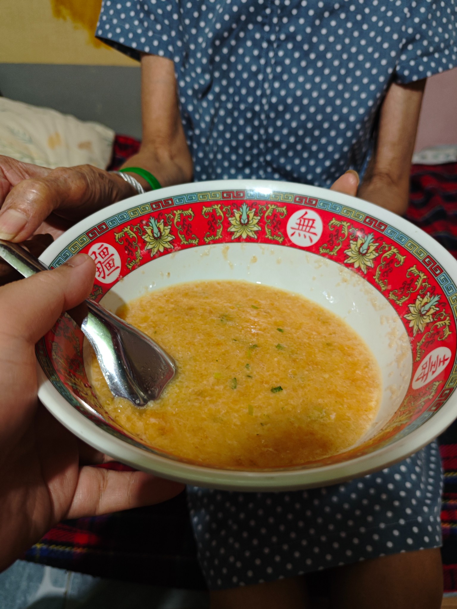 พอเสร็จแล้ว เตรียมป้อนให้แม่กินครับ แม่ผมเริ่มสำลักง่ายแล้ว ผมเลยต้องป้อนครับ แกเป็นคนรีบกินครับ พอบอกแกไปว่ากินช้าๆนะ แกก็ลืมครับ ผมก็เลยป้อนให้เลยดีกว่าครับ