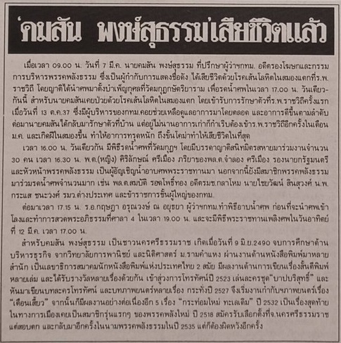 ถึงแม้ว่าคมสันได้จากไปอย่างสงบเมื่อต้นปี 2538 ตามที่เป็นข่าวในมุมเล็ก ๆ บนหน้าหนังสือพิมพ์ แต่ประวัติศาสตร์จะต้องจารึกไว้เลยว่า...