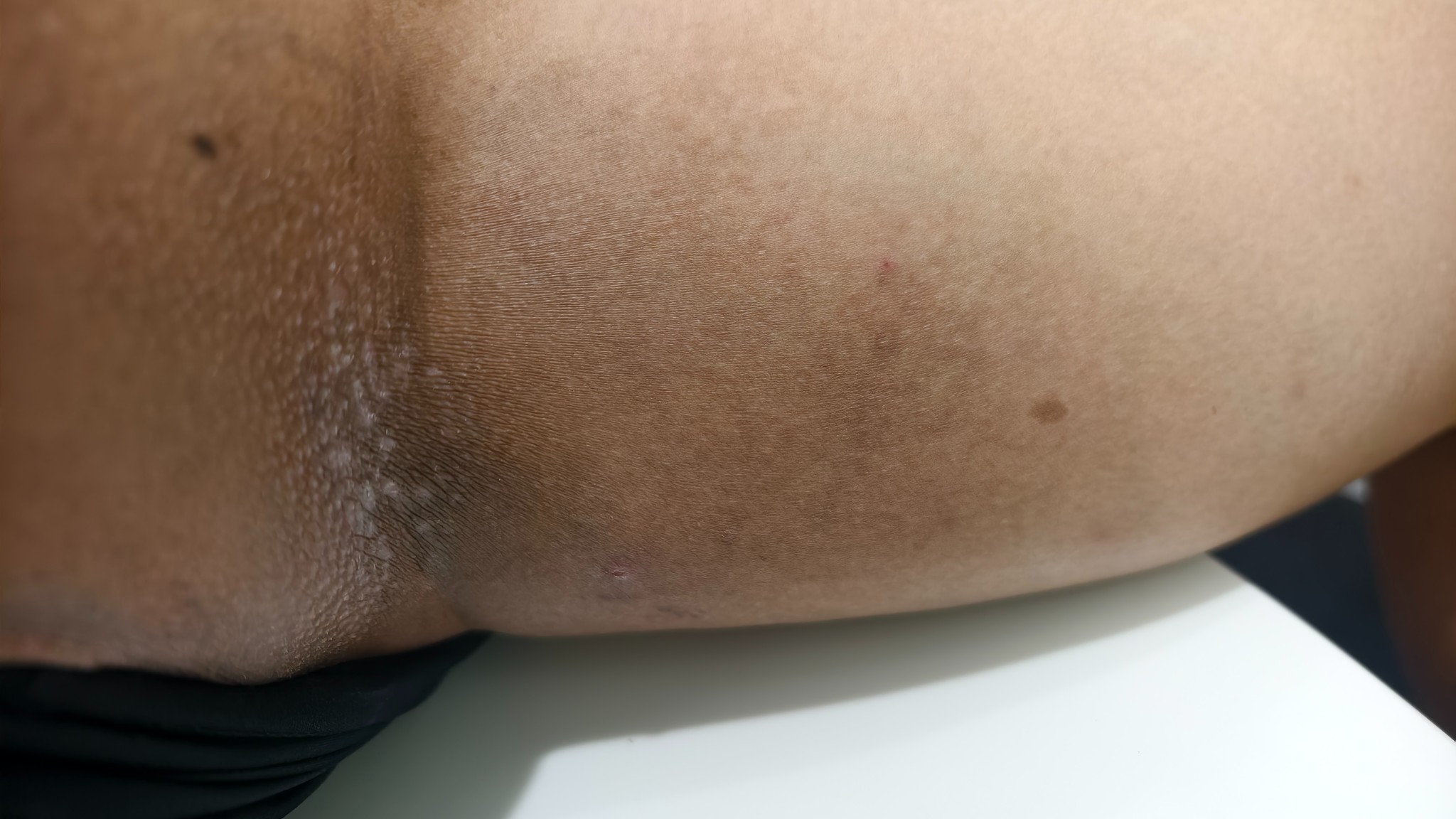อันนี้บริเวณข้างไข่หรือขาหนีบครับ เป็นทั้งสองฝั่งและลามไปจนถึงก้นเลยครับ