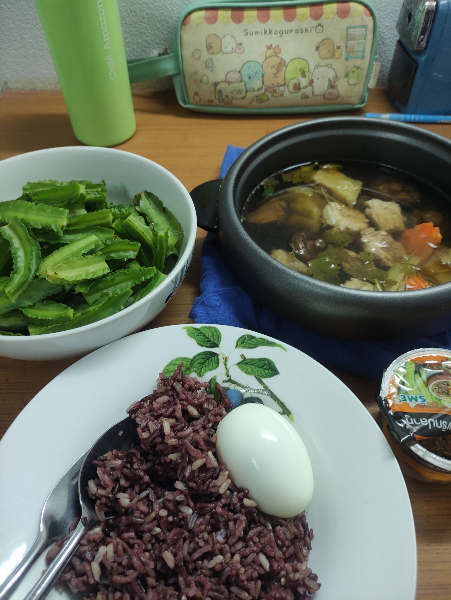 เย็นวันอาทิตย์ มื้อเย็นเป็นข้าวไรซ์เบอร์รี่ ต้มจืดมะระ ไข่ต้มแล้วก็ถั่วพูที่ไปซื้อจากตลาดน้ำท่าคา 20 บาท ได้เยอะมากกก ลวกกินกับน้ำพริกปลาทู กินได้อีกหลายมื้อ (ยังไม่หมด) จบท้ายมื้อด้วยช็อกโกแลตจากอิสราเอล ตอนแรกกินแล้วหวานมาก ตอนนี้ก็ยังหวานอยู่ กินได้วันละแค่ 1 ชิ้นพอ