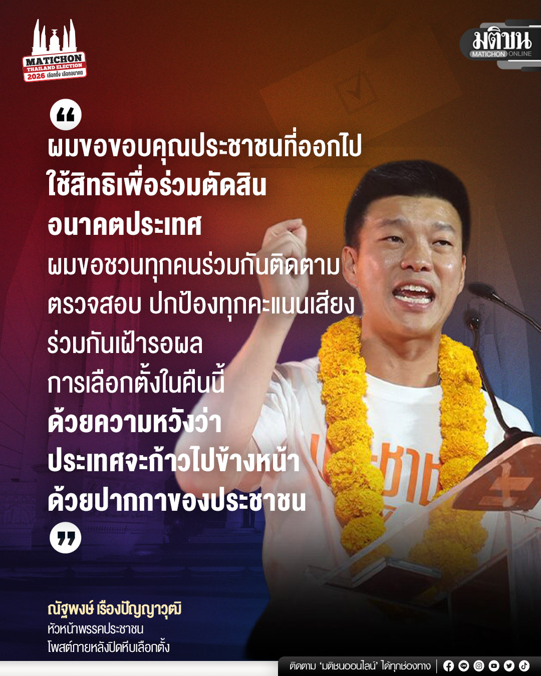 ขอขอบคุณประชาชนที่ออกไปใช้สิทธิเลือกตั้ง เพื่อร่วมตัดสินอนาคตประเทศในวันนี้ และขอขอบคุณสมาชิกพรรคประชาชน ผู้สมัคร ทีมงาน และอาสาสมัครทุกคน ที่ทำงานหนักให้การสนับสนุนพรรคตลอดระยะเวลาที่ผ่านมา