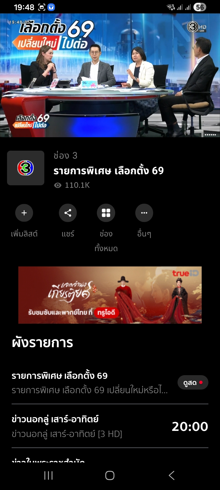 ช่อง 3 คนดูแสนแตกไปเรียบร้อย อันดับ 1 บน TrueID TV เวลา 19:48 น. 8 กุมภาพันธ์ 2569